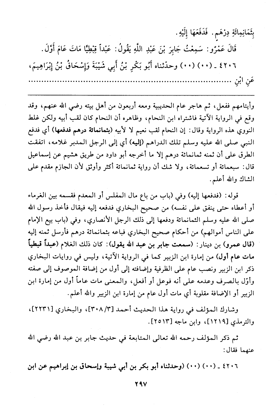 وأيتامهم ففعل، ثم هاجر عام الحديبية ومعه أربعون من أهل بيته -رضي الله عنهم-، وقد وقع في الرواية الآتية فاشتراه ابن النحام، وظاهره أن النحام كان لقب أبيه ولكن غلط النووي هذه الرواية وقال: إن النحام لقب نعيم لا لأبيه (بثمانمائة درهم فدفعها) أي فدفع النبي - صلى الله عليه وسلم - تلك الدراهم (إليه) أي إلى الرجل المدبر غلامه، اتفقت الطرق على أن ثمنه ثمانمائة درهم إلا ما أخرجه أبو داود من طريق هشيم عن إسماعيل قال: سبعمائة أو تسعمائة، ولا شك أن رواية ثمانمائة أكثر وأوثق لأن الجازم مقدم على الشاك والله أعلم.