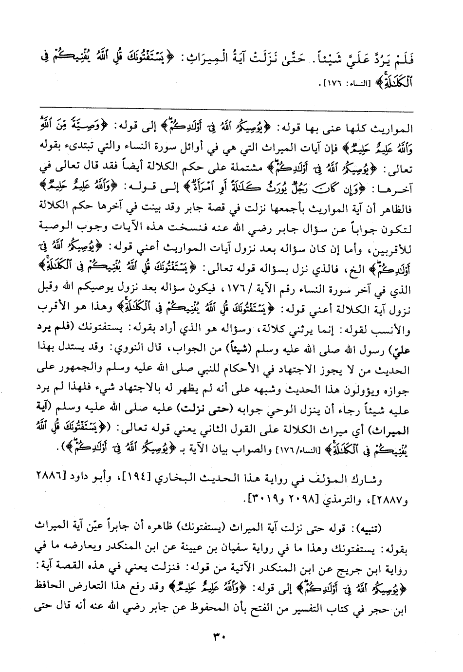 المواريث كلها عنى بها قوله: {يُوصِيكُمُ اللَّهُ فِي أَوْلَادِكُمْ} إلى قوله: {وَصِيَّةً مِنَ اللَّهِ وَاللَّهُ عَلِيمٌ حَلِيمٌ} فإن آيات الميراث التي هي في أوائل سورة النساء والتي تبتدئ بقوله تعالى: {يُوصِيكُمُ اللَّهُ فِي أَوْلَادِكُمْ} مشتملة على حكم الكلالة أيضًا فقد قال تعالى في آخرها: {وَإِنْ كَانَ رَجُلٌ يُورَثُ كَلَالةً أَو امْرَأَةٌ} إلى قوله: {وَاللَّهُ عَلِيمٌ حَلِيمٌ} فالظاهر أن آية المواريث بأجمعها نزلت في قصة جابر وقد بينت في آخرها حكم الكلالة لتكون جوابًا عن سؤال جابر رضي الله عنه فنسخت هذه الآيات وجوب الوصية للأقربين، وأما إن كان سؤاله بعد نزول آيات المواريث أعني قوله: {يُوصِيكُمُ اللَّهُ فِي أَوْلَادِكُمْ} الخ، فالذي نزل بسؤاله قوله تعالى: {يَسْتَفْتُونَكَ قُلِ اللَّهُ يُفْتِيكُمْ فِي الْكَلَالةِ} الذي في آخر سورة النساء رقم الآية / ١٧٦، فيكون سؤاله بعد نزول يوصيكم الله وقبل نزول آية الكلالة أعني قوله: {يَسْتَفْتُونَكَ قُلِ اللَّهُ يُفْتِيكُمْ فِي الْكَلَالةِ} وهذا هو الأقرب والأنسب لقوله: إنما يرثني كلالة، وسؤاله هو الذي أراد بقوله: يستفتونك (فلم يرد عليّ) رسول الله صلى الله عليه وسلم (شيئًا) من الجواب، قال النووي: وقد يستدل بهذا الحديث من لا يجوز الاجتهاد في الأحكام للنبي صلى الله عليه وسلم والجمهور على جوازه ويؤولون هذا الحديث وشبهه على أنه لم يظهر له بالاجتهاد شيء فلهذا لم يرد عليه شيئًا رجاء أن ينزل الوحي جوابه (حتى نزلت) عليه صلى الله عليه وسلم (آية الميراث) أي ميراث الكلالة على القول الثاني يعني قوله تعالى: {يَسْتَفْتُونَكَ قُلِ اللَّهُ يُفْتِيكُمْ فِي الْكَلَالةِ} [النساء: ١٧٦] والصواب بيان الآية بـ {يُوصِيكُمُ اللَّهُ فِي أَوْلَادِكُمْ}).