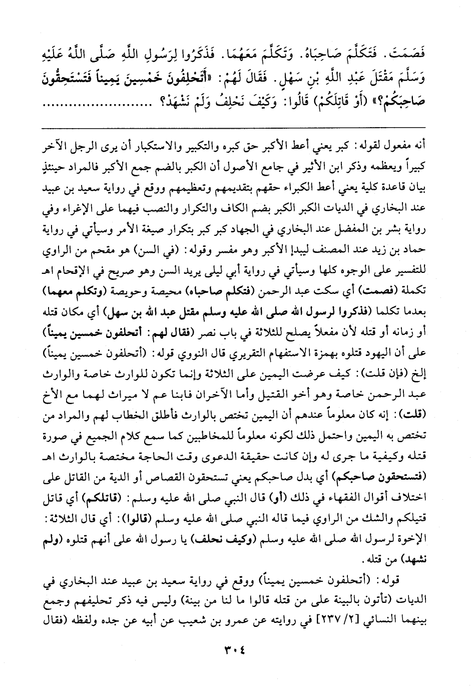 فَصَمَتَ. فَتَكَلَّمَ صَاحِبَاهُ. وَتَكَلَّمَ مَعَهُمَا. فَذَكَرُوا لِرَسُولِ اللهِ - صلى الله عليه وسلم - مَقْتَلَ عَبْدِ اللهِ بْنِ سَهْلٍ. فَقَال لَهُمْ: "أَتَحْلِفُونَ خَمْسِينَ يَمِينًا فَتَسْتَحِقُّونَ صَاحِبَكُمْ؟ " (أَوْ قَاتِلَكُمْ) قَالُوا: وَكَيفَ نَحْلِفُ وَلَمْ نَشْهَدْ؟