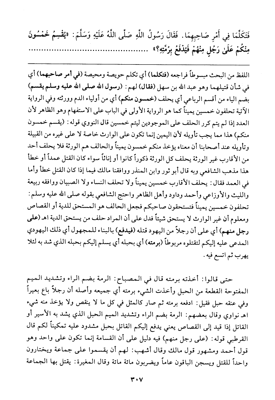 حتى قالوا: أخذته برمته قال في المصباح: الرمة بضم الراء وتشديد الميم المفتوحة القطعة من الحبل وأخذت الشيء برمته أي جميعه وأصله أن رجلًا باع بعيرًا وفي عنقه حبل فقيل: ادفعه برمته ثم صار كالمثل في كل ما لا ينقص ولا يؤخذ منه شيء اهـ نواوي وقال بعضهم: الرمة بضم الراء وتشديد الميم الحبل الذي يشد به الأسير أو القاتل إذا قيد إلى القصاص يعني يدفع إليكم القاتل بحبل مشدود عليه تمكينًا لكم قال القرطبي قوله: (على رجل منهم) فيه دليل على أن القسامة إنما تكون على واحد وهو قول أحمد ومشهور قول مالك وقال أشهب: لهم أن يقسموا على جماعة ويختارون واحدًا للقتل ويسجن الباقون عامًا ويضربون مائة مائة وقال المغيرة: يقتل بها الجماعة