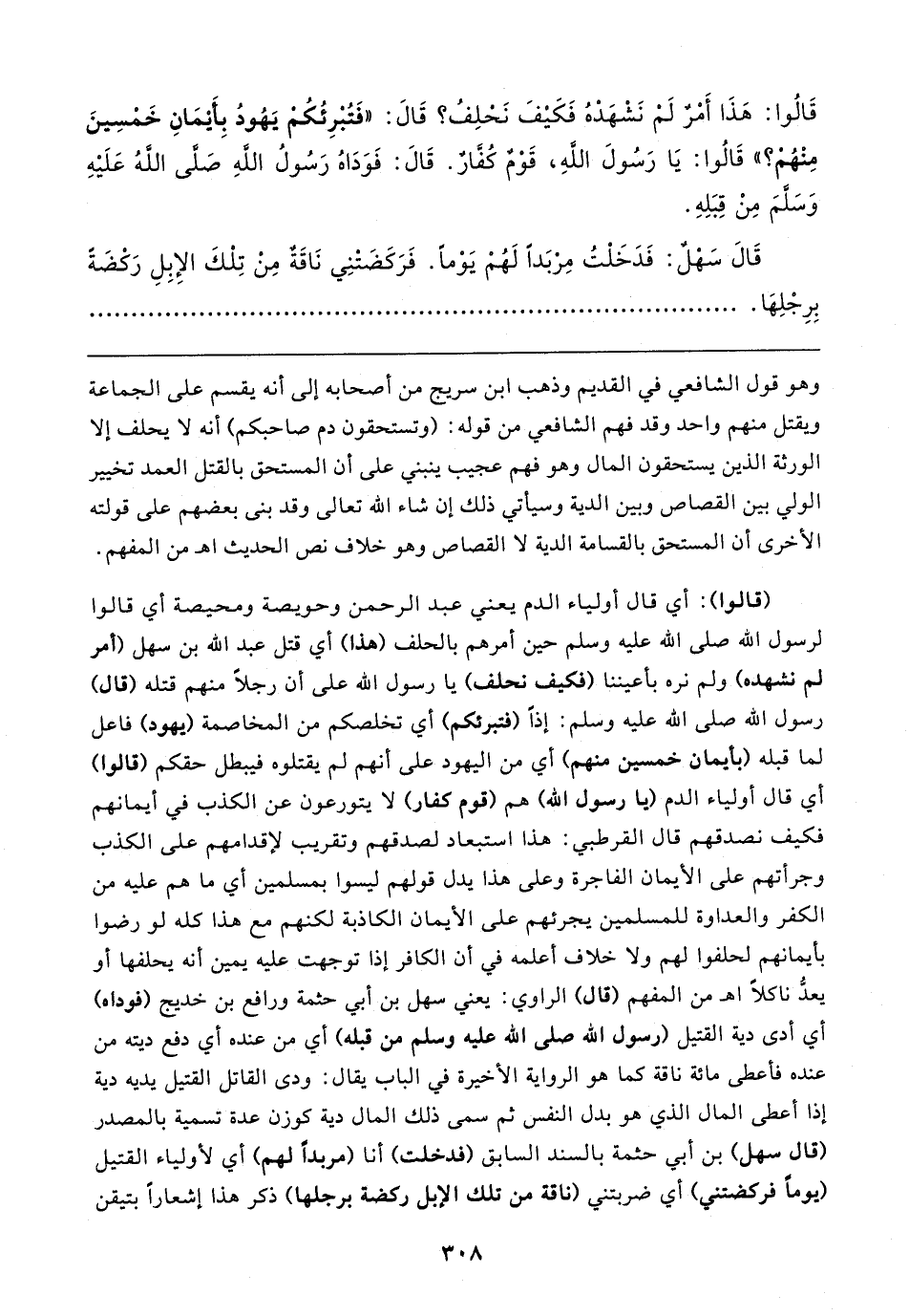 (قالوا): أي قال أولياء الدم يعني عبد الرحمن وحويصة ومحيصة أي قالوا لرسول الله - صلى الله عليه وسلم - حين أمرهم بالحلف (هذا) أي قتل عبد الله بن سهل (أمر لم نشهده) ولم نره بأعيننا (فكيف نحلف) يا رسول الله على أن رجلًا منهم قتله (قال) رسول الله - صلى الله عليه وسلم -: إذًا (فتبرئكم) أي تخلصكم من المخاصمة (يهود) فاعل لما قبله (بأيمان خمسين منهم) أي من اليهود على أنهم لم يقتلوه فيبطل حقكم (قالوا) أي قال أولياء الدم (يا رسول الله) هم (قوم كفار) لا يتورعون عن الكذب في أيمانهم فكيف نصدقهم قال القرطبي: هذا استبعاد لصدقهم وتقريب لإقدامهم على الكذب وجرأتهم على الأيمان الفاجرة وعلى هذا يدل قولهم ليسوا بمسلمين أي ما هم عليه من الكفر والعداوة للمسلمين يجرئهم على الأيمان الكاذبة لكنهم مع هذا كله لو رضوا بأيمانهم لحلفوا لهم ولا خلاف أعلمه في أن الكافر إذا توجهت عليه يمين أنه يحلفها أو يعدُّ ناكلًا اهـ من المفهم (قال) الراوي: يعني سهل بن أبي حثمة ورافع بن خديج (فوداه) أي أدى دية القتيل (رسول الله - صلى الله عليه وسلم - من قبله) أي من عنده أي دفع ديته من عنده فأعطى مائة ناقة كما هو الرواية الأخيرة في الباب يقال: ودى القاتل القتيل يديه دية إذا أعطى المال الذي هو بدل النفس ثم سمى ذلك المال دية كوزن عدة تسمية بالمصدر (قال سهل) بن أبي حثمة بالسند السابق (فدخلت) أنا (مربدًا لهم) أي لأولياء القتيل (يومًا فركضتني) أي ضربتني (ناقة من تلك الإبل ركضة برجلها) ذكر هذا إشعارًا بتيقن