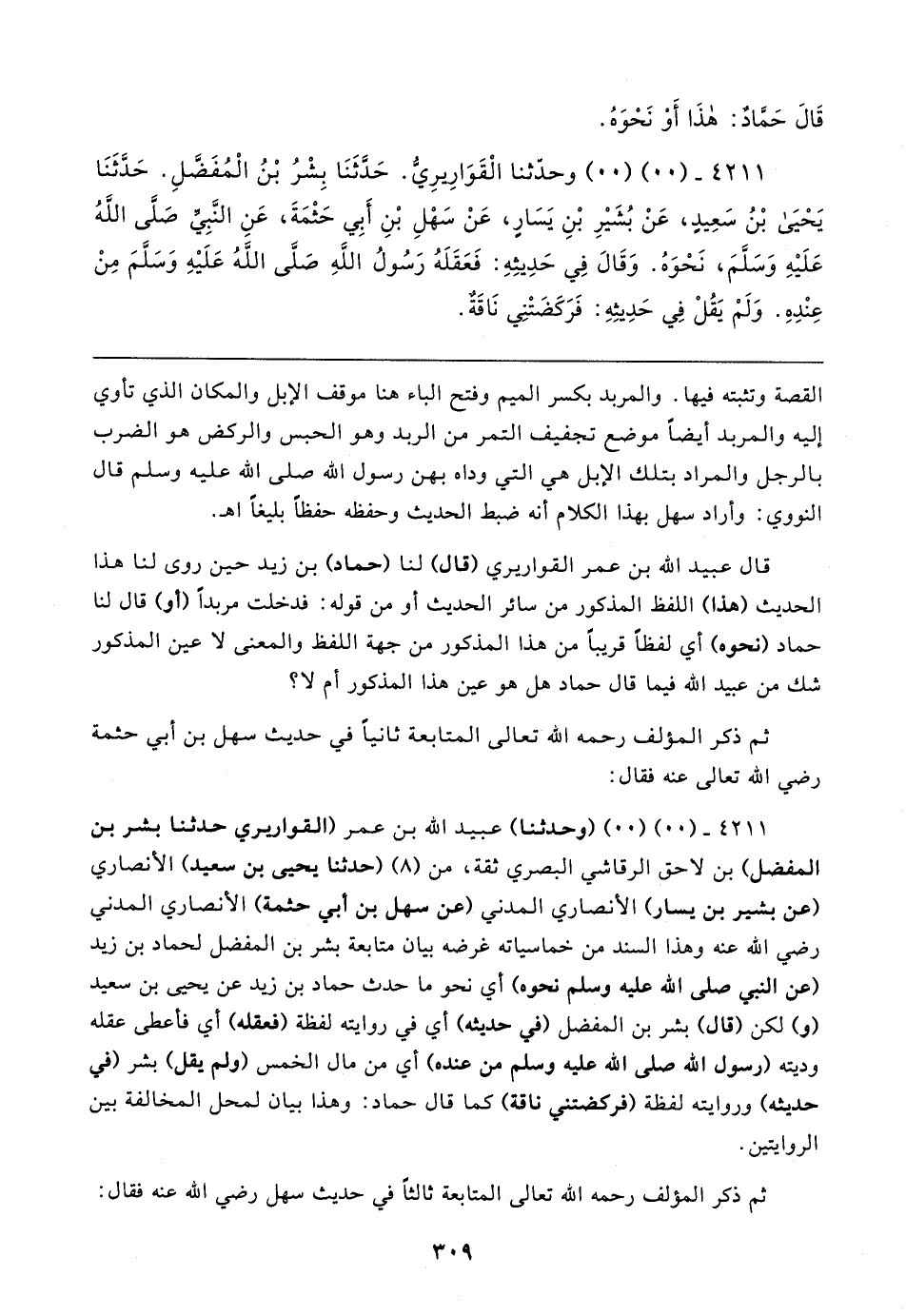 ٤٢١١ - (٠٠) (٠٠) (وحدثنا) عبيد الله بن عمر (القواريري حدثنا بشر بن المفضل) بن لاحق الرقاشي البصري ثقة، من (٨) (حدثنا يحيى بن سعيد) الأنصاري (عن بشير بن يسار) الأنصاري المدني (عن سهل بن أبي حثمة) الأنصاري المدني - رضي الله عنه - وهذا السند من خماسياته غرضه بيان متابعة بشر بن المفضل لحماد بن زيد (عن النبي - صلى الله عليه وسلم - نحوه) أي نحو ما حدث حماد بن زيد عن يحيى بن سعيد (و) لكن (قال) بشر بن المفضل (في حديثه) أي في روايته لفظة (فعقله) أي فأعطى عقله وديته (رسول الله - صلى الله عليه وسلم - من عنده) أي من مال الخمس (ولم يقل) بشر (في حديثه) وروايته لفظة (فركضتني ناقة) كما قال حماد: وهذا بيان لمحل المخالفة بين الروايتين.