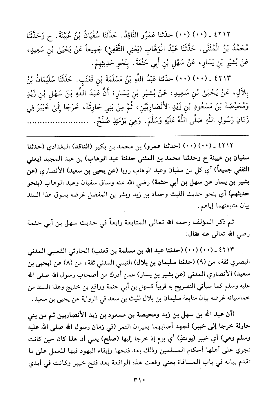 ٤٢١٢ - (٠٠) (٠٠) (حدثنا عمرو) بن محمد بن بكير (الناقد) البغدادي (حدثنا سفيان بن عيينة ح وحدثنا محمد بن المثنى حدثنا عبد الوهاب) بن عبد المجيد (يعني الثقفي جميعًا) أي كل من سفيان وعبد الوهاب رويا (عن يحيى بن سعيد) الأنصاري (عن بشير بن يسار عن سهل بن أبي حثمة) - رضي الله عنه - وساق سفيان وعبد الوهاب (بنحو حديثهم) أي بنحو حديث الليث وحماد بن زيد وبشر بن المفضل غرضه بسوق هذا السند بيان متابعتهما إياهم.