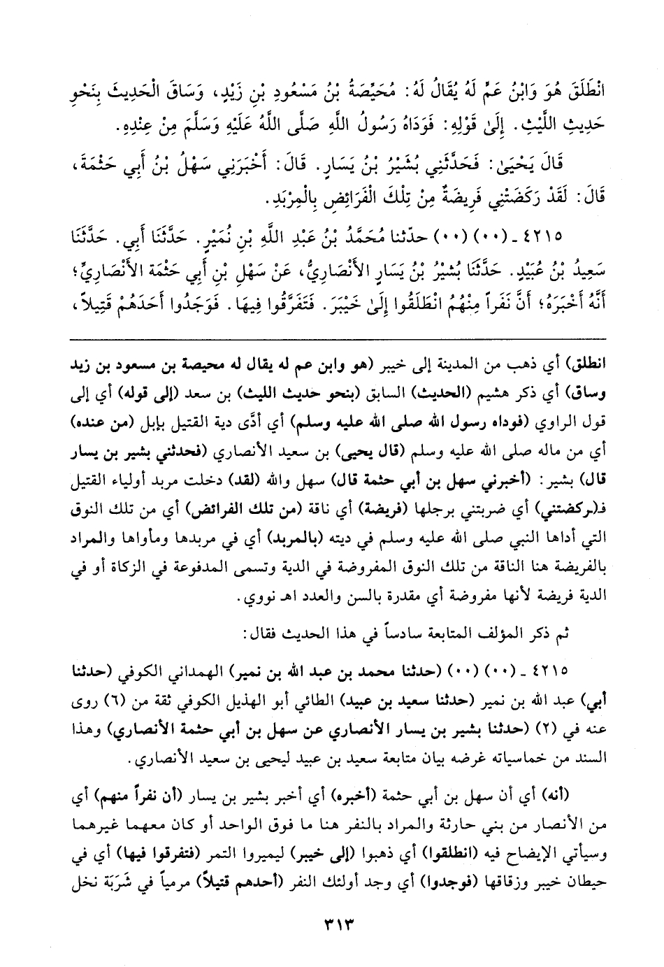 ٤٢١٥ - (٠٠) (٠٠) حدَّثنا مُحَمَّدُ بْنُ عَبْدِ اللهِ بْنِ نُمَيرٍ. حَدَّثَنَا أَبِي. حَدَّثَنَا سَعِيدُ بْنُ عُبَيدٍ. حَدَّثنَا بُشيرُ بْنُ يَسَارٍ الأَنْصَارِيُّ، عَنْ سَهْلِ بْنِ أَبِي حَثْمَة الأَنْصَارِيِّ؛ أَنَّهُ أَخْبَرَهُ؛ أَنَّ نَفَرًا مِنهُمُ انْطَلَقُوا إِلَى خَيبَرَ. فَتَفَرَّقُوا فِيهَا. فَوَجَدُوا أَحَدَهُمْ قَتِيلًا،