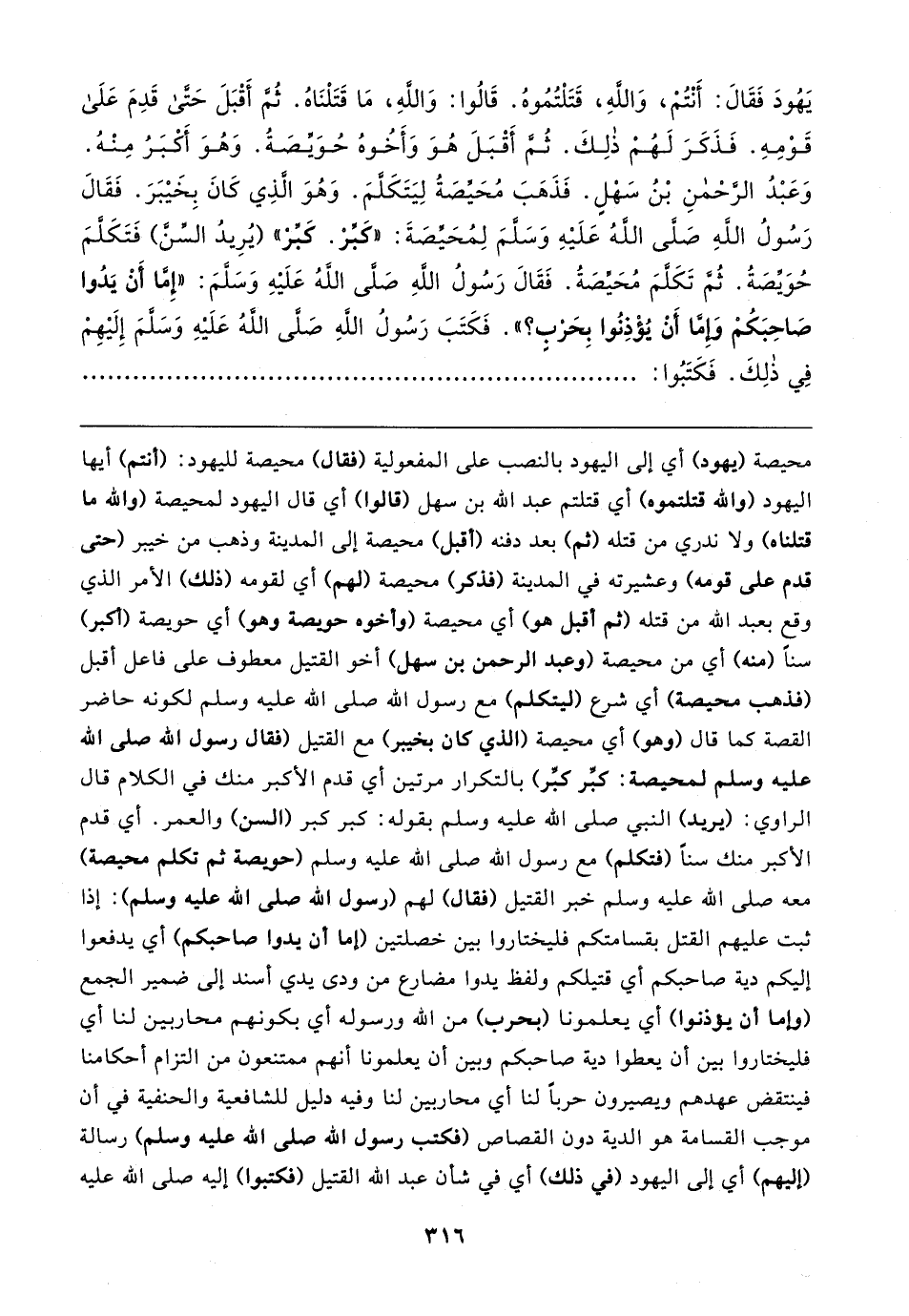 محيصة (يهود) أي إلى اليهود بالنصب على المفعولية (فقال) محيصة لليهود: (أنتم) أيها اليهود (والله قتلتموه) أي قتلتم عبد الله بن سهل (قالوا) أي قال اليهود لمحيصة (والله ما قتلناه) ولا ندري من قتله (ثم) بعد دفنه (أقبل) محيصة إلى المدينة وذهب من خيبر (حتى قدم على قومه) وعشيرته في المدينة (فذكر) محيصة (لهم) أي لقومه (ذلك) الأمر الذي وقع بعبد الله من قتله (ثم أقبل هو) أي محيصة (وأخوه حويصة وهو) أي حويصة (أكبر) سنًّا (منه) أي من محيصة (وعبد الرحمن بن سهل) أخو القتيل معطوف على فاعل أقبل (فذهب محيصة) أي شرع (ليتكلم) مع رسول الله - صلى الله عليه وسلم - لكونه حاضر القصة كما قال (وهو) أي محيصة (الذي كان بخيبر) مع القتيل (فقال رسول الله - صلى الله عليه وسلم - لمحيصة: كبِّر كبِّر) بالتكرار مرتين أي قدم الأكبر منك في الكلام قال الراوي: (يريد) النبي - صلى الله عليه وسلم - بقوله: كبر كبر (السن) والعمر. أي قدم الأكبر منك سنًّا (فتكلم) مع رسول الله - صلى الله عليه وسلم - (حويصة ثم تكلم محيصة) معه - صلى الله عليه وسلم - خبر القتيل (فقال) لهم (رسول الله - صلى الله عليه وسلم -): إذا ثبت عليهم القتل بقسامتكم فليختاروا بين خصلتين (إما أن يدوا صاحبكم) أي يدفعوا إليكم دية صاحبكم أي قتيلكم ولفظ يدوا مضارع من ودى يدي أسند إلى ضمير الجمع (وإما أن يؤذنوا) أي يعلمونا (بحرب) من الله ورسوله أي بكونهم محاربين لنا أي فليختاروا بين أن يعطوا دية صاحبكم وبين أن يعلمونا أنهم ممتنعون من التزام أحكامنا فينتقض عهدهم ويصيرون حربًا لنا أي محاربين لنا وفيه دليل للشافعية والحنفية في أن موجب القسامة هو الدية دون القصاص (فكتب رسول الله - صلى الله عليه وسلم -) رسالة (إليهم) أي إلى اليهود (في ذلك) أي في شأن عبد الله القتيل (فكتبوا) إليه - صلى الله عليه
