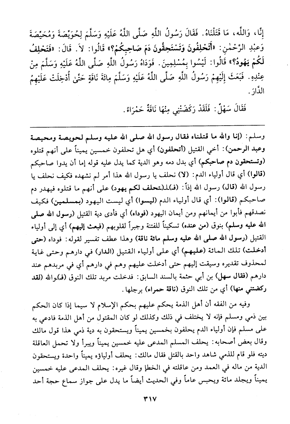 وسلم -: (إنا والله ما قتلناه فقال رسول الله - صلى الله عليه وسلم - لحويصة ومحيصة وعبد الرحمن): أخي القتيل (أتحلفون) أي هل تحلفون خمسين يمينًا على أنهم قتلوه (وتستحقون دم صاحبكم) أي بدل دمه وهو الدية كما يدل عليه قوله إما أن يدوا صاحبكم (قالوا) أي قال أولياء الدم: (لا) نحلف يا رسول الله هذا أمر لم نشهده فكيف نحلف يا رسول الله (قال) رسول الله إذًا: (فـ) ـلـ (ـتحلف لكم يهود) على أنهم ما قتلوه فيهدر دم صاحبكم (قالوا): أي قال أولياء الدم (ليسوا) أي ليست اليهود (بمسلمين) فكيف نصدقهم فأبوا من أيمانهم ومن أيمان اليهود (فوداه) أي فأدى دية القتيل (رسول الله - صلى الله عليه وسلم -) بنوق (من عنده) تسكينًا للفتنة وجبرًا لقلوبهم (فبعث إليهم) أي إلى أولياء القتيل (رسول الله - صلى الله عليه وسلم - مائة ناقة) وهذا عطف تفسير لقوله: فوداه (حتى أدخلت) تلك المائة (عليهم) أي على أولياء القتيل (الدار) في دارهم وحتى غاية لمحذوف تقديره وسيقت إليهم حتى أدخلت عليهم وهم في دارهم أي في مربدهم عند دارهم (فقال سهل) بن أبي حثمة بالسند السابق: فدخلت مربد تلك النوق (فـ) ـوالله (لقد ركضتني منها) أي من تلك النوق (ناقة حمراء) برجلها.