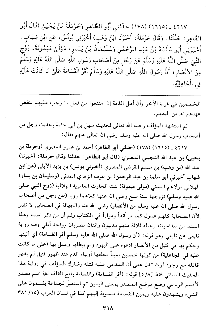 ٤٢١٧ - (١٦١٥) (١٧٨) حدّثني أَبُو الطَّاهِرِ وَحَرْمَلَةُ بْنُ يَحْيَى (قَال أَبُو الطَّاهِرِ: حَدَّثَنَا. وَقَال حَرْمَلةُ: أَخْبَرَنَا ابْنُ وَهْبٍ) أَخْبَرَنِي يُونُسُ، عَنِ ابْنِ شِهَابٍ. أَخْبَرَنِي أَبُو سَلَمَةَ بْنُ عَبْدِ الرَّحْمنِ وَسُلَيمَانُ بْنُ يَسَارٍ، مَوْلَى مَيمُونَةَ، زَوْجِ النَّبِيِّ - صلى الله عليه وسلم - عَنْ رَجُلٍ مِنْ أَصْحَاب رَسُولِ اللهِ - صلى الله عليه وسلم - مِنَ الأَنْصَارِ؛ أَنَّ رَسُولَ اللهِ - صلى الله عليه وسلم - أَقَرَّ الْقَسَامَةَ عَلَى مَا كَانَتْ عَلَيهِ فِي الْجَاهِلِيَّةِ