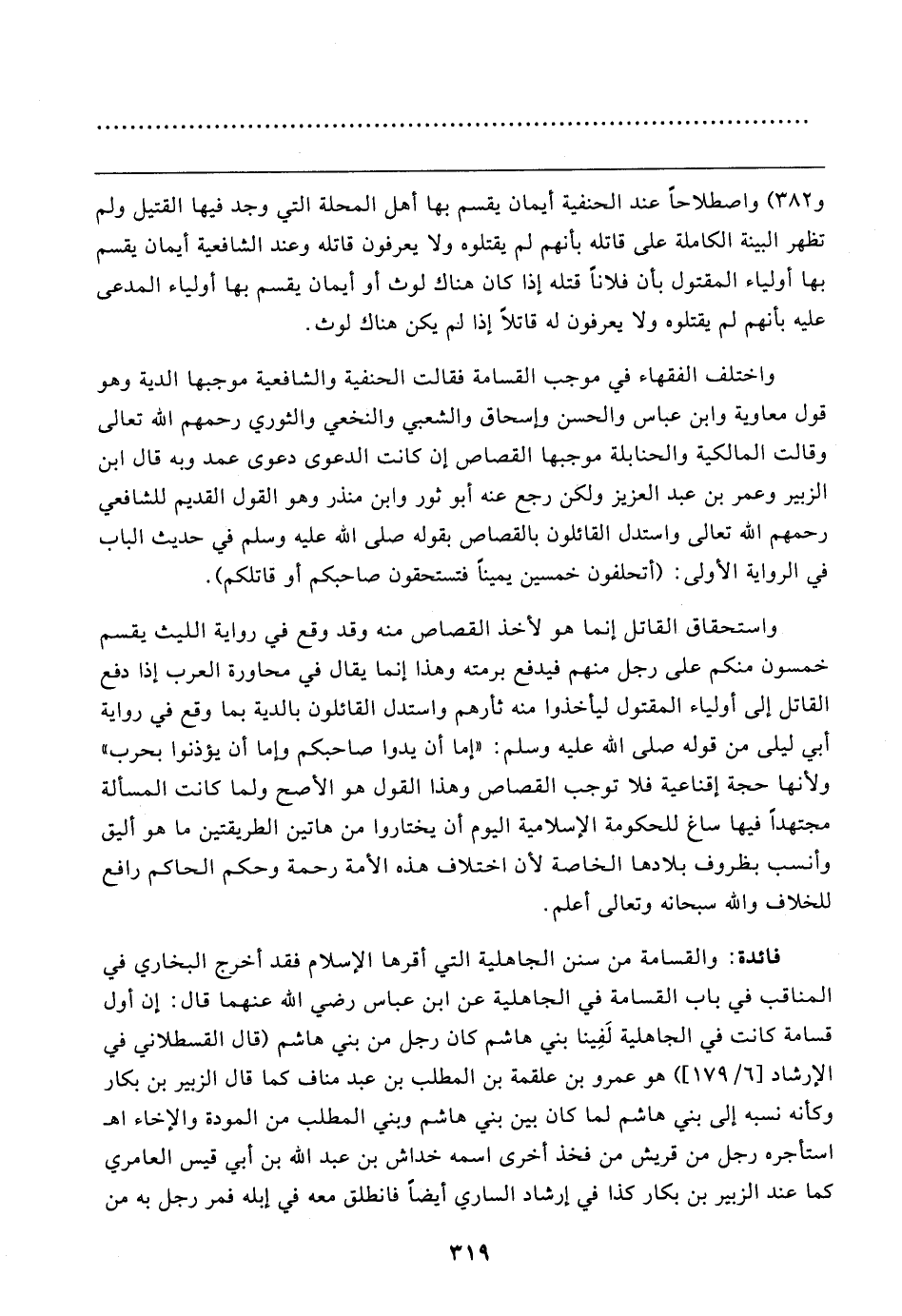 فائدة: والقسامة من سنن الجاهلية التي أقرها الإسلام فقد أخرج البخاري في المناقب في باب القسامة في الجاهلية عن ابن عباس رضي الله عنهما قال: إن أول قسامة كانت في الجاهلية لَفِينا بني هاشم كان رجل من بني هاشم (قال القسطلاني في الإرشاد [٦/ ١٧٩]) هو عمرو بن علقمة بن المطلب بن عبد مناف كما قال الزبير بن بكار وكأنه نسبه إلى بني هاشم لما كان بين بني هاشم وبني المطلب من المودة والإخاء اهـ استأجره رجل من قريش من فخذ أخرى اسمه خداش بن عبد الله بن أبي قيس العامري كما عند الزبير بن بكار كذا في إرشاد الساري أيضًا فانطلق معه في إبله فمر رجل به من
