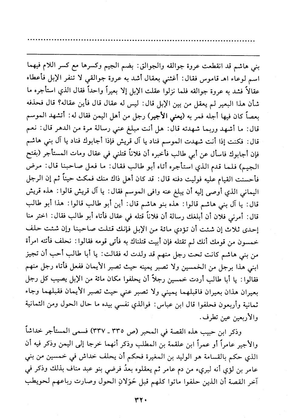 بني هاشم قد انقطعت عروة جوالقه والجوالق: بضم الجيم وكسرها مع كسر اللام فيهما اسم لوعاء اهـ قاموس فقال: أغثني بعقال أشد به عروة جوالقي لا تنفر الإبل فأعطاه عقالًا فشد به عروة جوالقه فلما نزلوا عقلت الإبل إلا بعيرًا واحدًا فقال الذي استأجره ما شأن هذا البعير لم يعقل من بين الإبل قال: ليس له عقال قال فأين عقاله؟ قال فحذفه بعصًا كان فيها أجله فمر به (يعني الأجير) رجل من أهل اليمن فقال له: أتشهد الموسم قال: ما أشهد وربما شهدته قال: هل أنت مبلغ عني رسالة مرة من الدهر قال: نعم قال: فكنت إذا أنت شهدت الموسم فناد يا آل قريش فإذا أجابوك فناد يا آل بني هاشم فإن أجابوك فاسأل عن أبي طالب فأخبره أن فلانًا قتلني في عقال ومات المستأجر (بفتح الجيم) فلما قدم الذي استأجره أتاه أبو طالب فقال: ما فعل صاحبنا قال: مرض فأحسنت القيام عليه فوليت دفنه قال: قد كان أهل ذاك منك فمكث حينًا ثم إن الرجل اليماني الذي أوصى إليه أن يبلغ عنه وافى الموسم فقال: يا آل قريش قالوا: هذه قريش قال: يا آل بني هاشم قالوا: هذه بنو هاشم قال: أين أبو طالب قالوا: هذا أبو طالب قال: أمرني فلان أن أبلغك رسالة أن فلانًا قتله في عقال فأتاه أبو طالب فقال: اختر منا إحدى ثلاث إن شئت أن تؤدي مائة من الإبل فإنك قتلت صاحبنا وإن شئت حلف خمسون من قومك أنك لم تقتله فإن أبيت قتلناك به فأتى قومه فقالوا: نحلف فأتته امرأة من بني هاشم كانت تحت رجل منهم قد ولدت له فقالت: يا أبا طالب أحب أن تجيز ابني هذا برجل من الخمسين ولا تصبر يمينه حيث تصبر الأيمان ففعل فأتاه رجل منهم فقالوا: يا أبا طالب أردت خمسين رجلًا أن يحلفوا مكان مائة من الإبل يصيب كل رجل بعيران هذان بعيران فاقبلهما يميني ولا تصبر عني حيث تصبر الأيمان فقبلهما وجاء ثمانية وأربعون فحلفوا قال ابن عباس: فوالذي نفسي بيده ما حال الحول ومن الثمانية والأربعين عين تطرف.