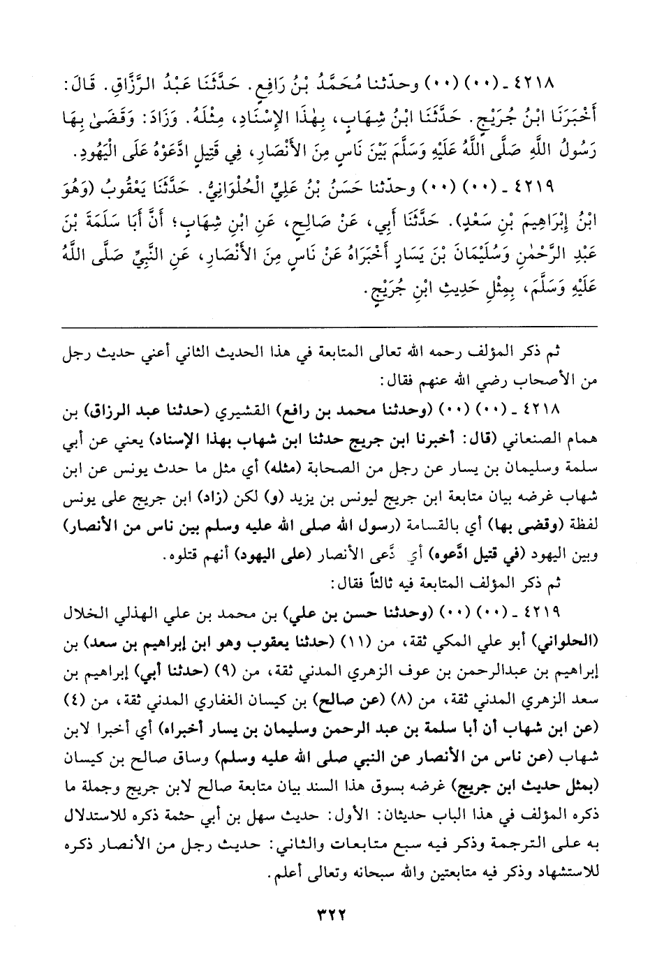 ٤٢١٩ - (٠٠) (٠٠) (وحدثنا حسن بن علي) بن محمد بن علي الهذلي الخلال (الحلواني) أبو علي المكي ثقة، من (١١) (حدثنا يعقوب وهو ابن إبراهيم بن سعد) بن إبراهيم بن عبد الرحمن بن عوف الزهري المدني ثقة، من (٩) (حدثنا أبي) إبراهيم بن سعد الزهري المدني ثقة، من (٨) (عن صالح) بن كيسان الغفاري المدني ثقة، من (٤) (عن ابن شهاب أن أبا سلمة بن عبد الرحمن وسليمان بن يسار أخبراه) أي أخبرا لابن شهاب (عن ناس من الأنصار عن النبي صلى الله عليه وسلم) وساق صالح بن كيسان (بمثل حديث ابن جريج) غرضه بسوق هذا السند بيان متابعة صالح لابن جريج وجملة ما ذكره المؤلف في هذا الباب حديثان: الأول: حديث سهل بن أبي حثمة ذكره للاستدلال به على الترجمة وذكر فيه سبع متابعات والثاني: حديث رجل من الأنصار ذكره للاستشهاد وذكر فيه متابعتين والله سبحانه وتعالى أعلم.