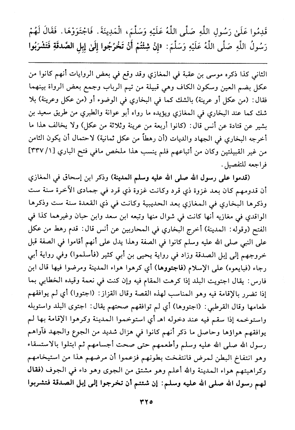 قَدِمُوا عَلَى رَسُولِ اللهِ صَلَّى اللهُ عَلَيهِ وَسَلَّمَ، الْمَدِينَةَ. فَاجْتَوَوْهَا. فَقَال لَهُمْ رَسُولُ اللهِ صَلَّى اللهُ عَلَيهِ وَسَلَّمَ: "إِنْ شِئْتُمْ أَنْ تَخْرُجُوا إِلَى إِبِلِ الصَّدقَةِ فَتَشْرَبُوا