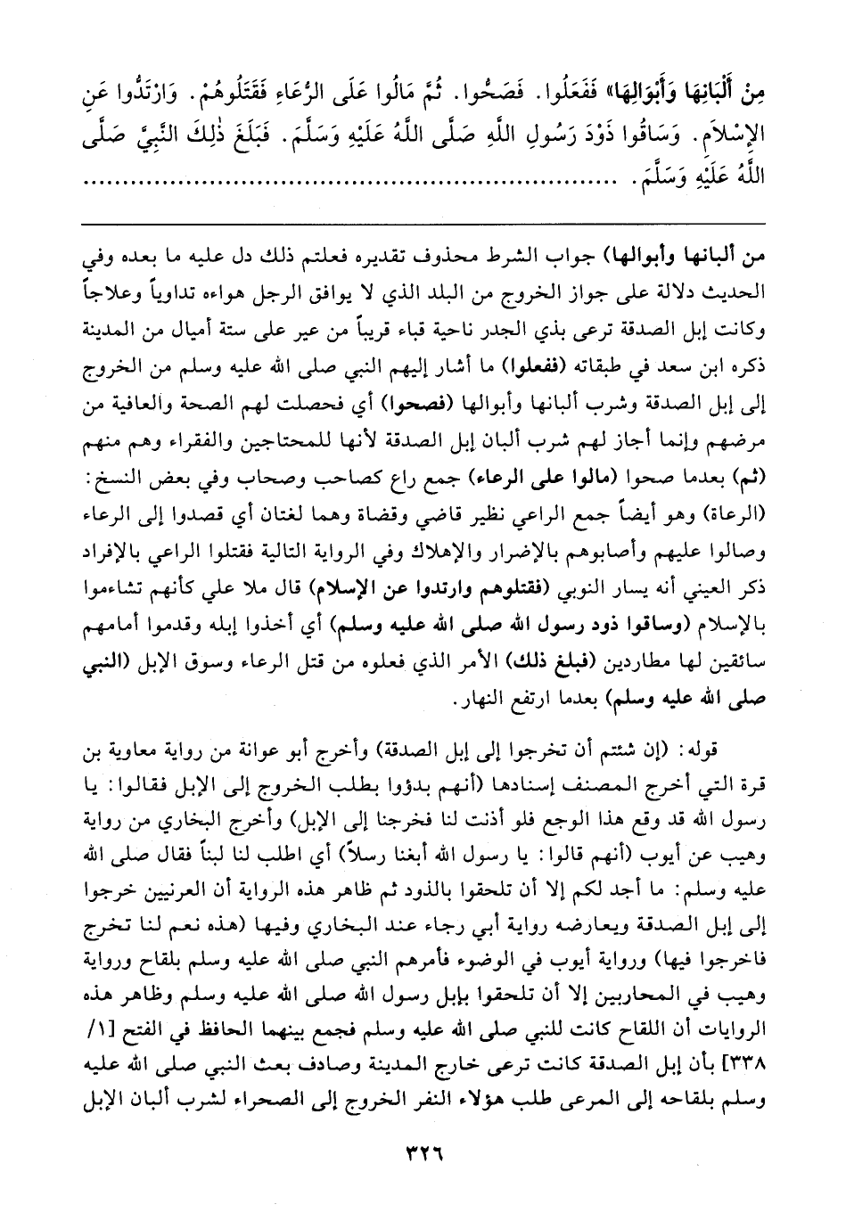 مِنْ أَلْبَانِهَا وَأَبْوَالِهَا" فَفَعَلُوا. فَصَحُّوا. ثُمَّ مَالُوا عَلَى الرُّعَاءِ فَقَتَلُوهُمْ. وَارْتَدُّوا عَنِ الإسْلامِ. وَسَاقُوا ذَوْدَ رَسُولِ اللهِ صَلَّى اللَّهُ عَلَيهِ وَسَلَّمَ. فَبَلَغَ ذلِكَ النَّبِيَّ صَلَّى اللَّهُ عَلَيهِ وَسَلَّمَ