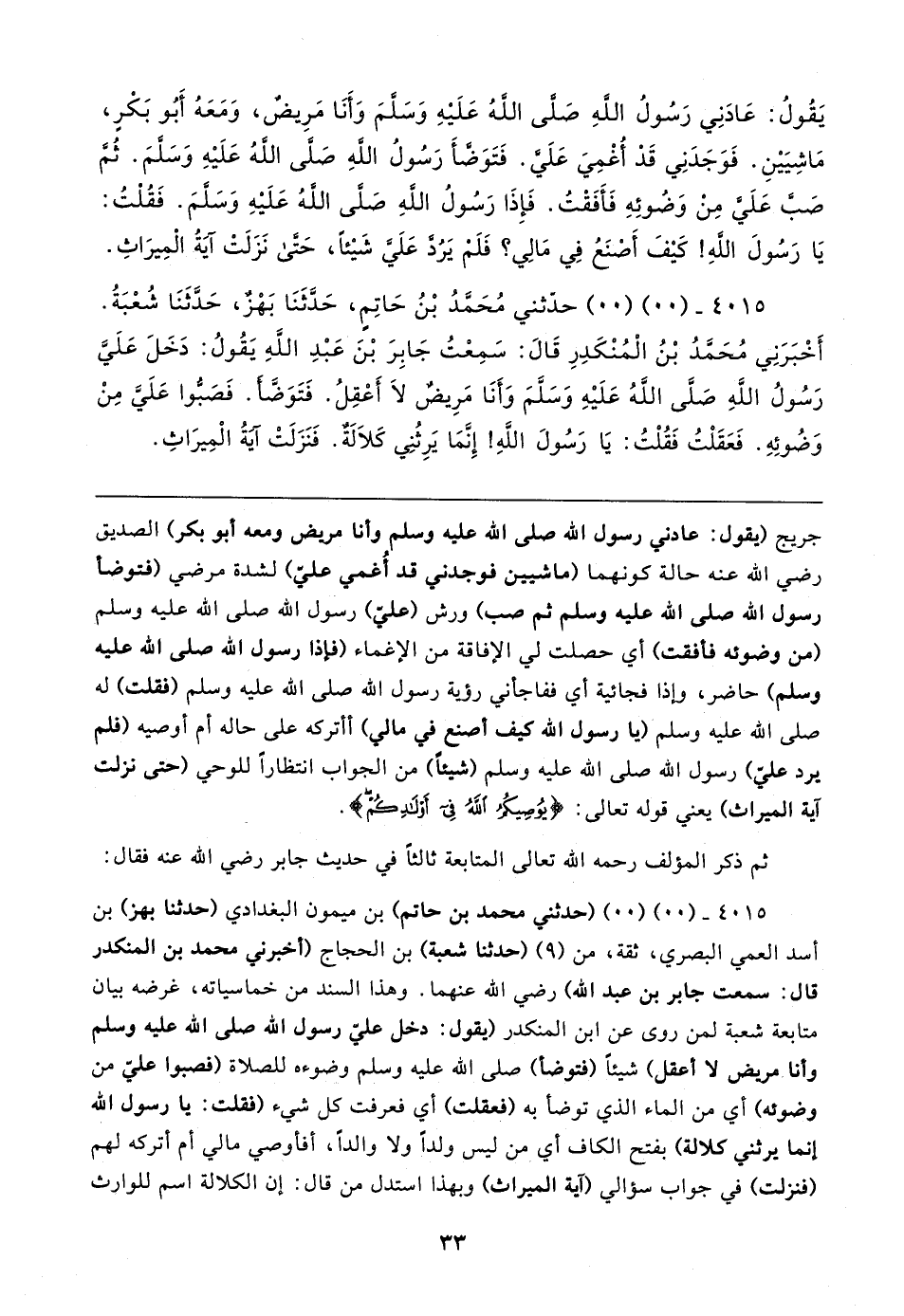 يَقُولُ: عَادَنِي رَسُولُ اللهِ صَلَّى اللهُ عَلَيهِ وَسَلَّمَ وَأَنَا مَرِيضٌ، وَمَعَهُ أَبُو بَكْرٍ، مَاشِيَينِ. فَوَجَدَنِي قَدْ أُغْمِيَ عَلَيَّ. فَتَوَضَّأَ رَسُولُ اللهِ صَلَّى اللهُ عَلَيهِ وَسَلَّمَ. ثُمَّ صَبَّ عَلَيَّ مِنْ وَضُوئِهِ فَأَفَقْتُ. فَإِذَا رَسُولُ اللهِ صَلَّى اللهُ عَلَيهِ وَسَلَّمَ. فَقُلْتُ: يَا رَسُولَ اللهِ! كَيفَ أَصْنَعُ فِي مَالِي؟ فَلَمْ يَرُدَّ عَلَي شَيئًا، حَتَّى نَزَلَتْ آيَةُ الْمِيرَاثِ.