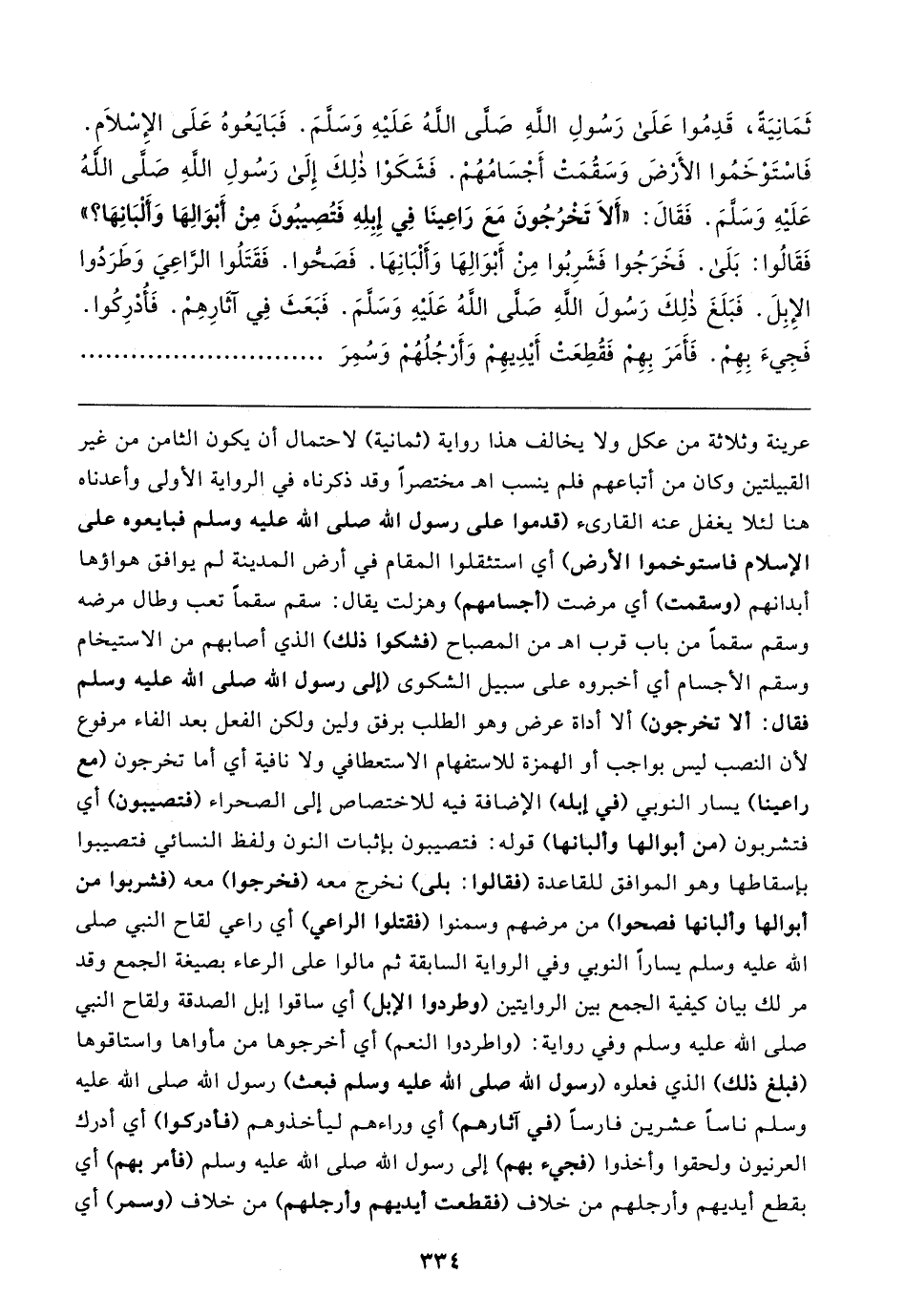 ثَمَانِيَةً، قَدِمُوا عَلَى رَسُولِ اللهِ صَلَّى اللهُ عَلَيهِ وَسَلَّمَ. فَبَايَعُوهُ عَلَى الإسْلام. فَاسْتَوْخَمُوا الأَرْضَ وَسَقُمَتْ أَجْسَامُهُمْ. فَشَكَوْا ذلِكَ إِلَى رَسُولِ اللهِ صلَّى اللهُ عَلَيهِ وَسَلَّمَ. فَقَال: "أَلا تَخْرُجُونَ مَعَ رَاعِينَا فِي إِبِلِهِ فَتُصِيبُونَ مِنْ أَبْوَالِهَا وَأَلْبَانِهَا؟ " فَقَالُوا: بَلَى. فَخَرَجُوا فَشَرِبُوا مِنْ أَبْوَالِهَا وَأَلْبَانِهَا. فَصَحُّوا. فَقَتَلُوا الرَّاعِيَ وَطَرَدُوا الإِبِلَ. فَبَلَغَ ذلِكَ رَسُولَ اللهِ صَلَّى اللهُ عَلَيهِ وَسَلَّمَ. فَبَعَثَ فِي آثَارِهِمْ. فَأُدْرِكُوا. فَجِيءَ بِهِمْ. فَأَمَرَ بِهِمْ فَقُطِعَتْ أَيدِيهِمْ وَأَرْجُلُهُمْ وَسُمِرَ