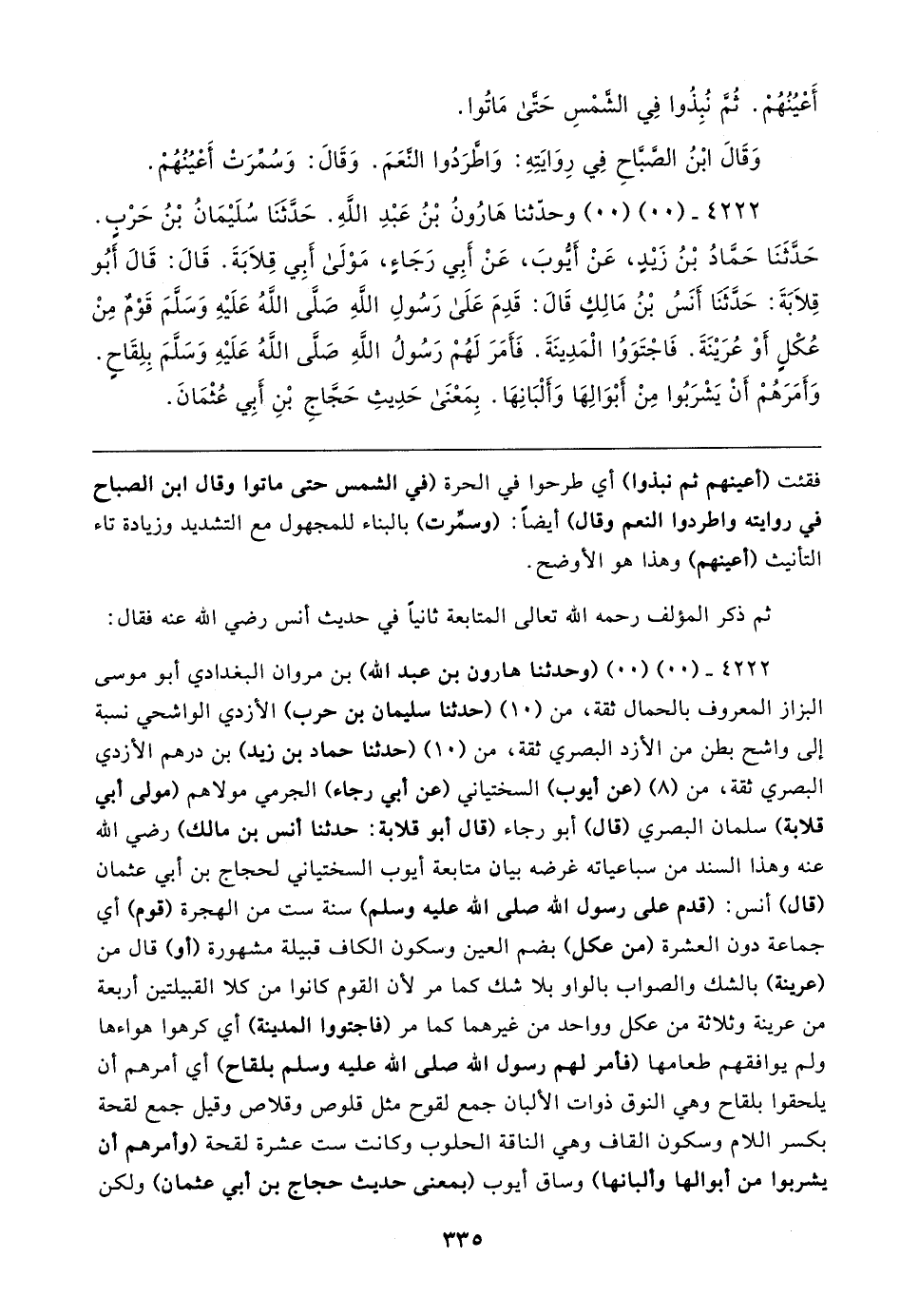 ٤٢٢٢ - (٠٠) (٠٠) وحدّثنا هَارُونُ بْنُ عَبْدِ اللهِ. حَدَّثَنَا سُلَيمَانُ بْنُ حَرْبٍ. حَدَّثَنَا حَمَّادُ بْنُ زَيدٍ، عَنْ أَيُّوبَ، عَنْ أَبِي رَجَاءٍ، مَوْلَى أَبِي قِلابَةَ. قَال: قَال أَبُو قِلابَةَ: حَدَّثَنَا أَنَسُ بْنُ مَالِكٍ قَال: قَدِمَ عَلَى رَسُولِ اللهِ صَلَّى اللَّهُ عَلَيهِ وَسَلَّمَ قَوْمٌ مِنْ عُكْلٍ أَوْ عُرَينَةَ. فَاجْتَوَوُا الْمَدِينَةَ. فَأَمَرَ لَهُمْ رَسُولُ اللهِ صَلَّى اللهُ عَلَيهِ وَسَلَّمَ بِلِقَاحٍ. وَأَمَرَهُمْ أَنْ يَشْرَبُوا مِنْ أَبْوَالِهَا وَأَلْبَانِهَا. بِمَعْنَى حَدِيثِ حَجَّاجِ بْنِ أَبِي عُثْمَانَ