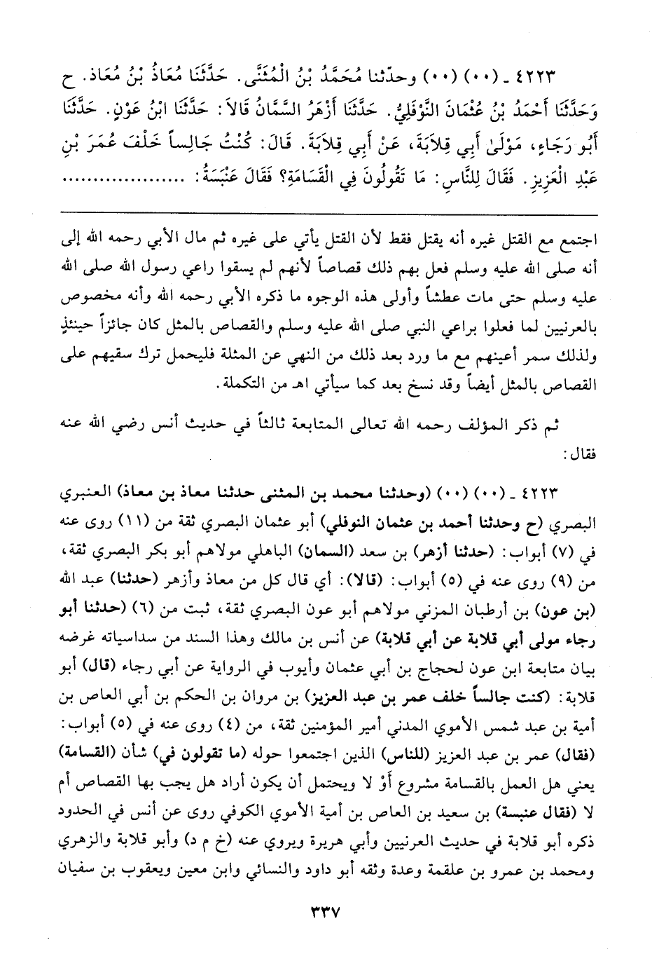 ٤٢٢٣ - (٠٠) (٠٠) (وحدثنا محمد بن المثنى حدثنا معاذ بن معاذ) العنبري البصري (ح وحدثنا أحمد بن عثمان النوفلي) أبو عثمان البصري ثقة من (١١) روى عنه في (٧) أبواب: (حدثنا أزهر) بن سعد (السمان) الباهلي مولاهم أبو بكر البصري ثقة، من (٩) روى عنه في (٥) أبواب: (قالا): أي قال كل من معاذ وأزهر (حدثنا) عبد الله (بن عون) بن أرطبان المزني مولاهم أبو عون البصري ثقة، ثبت من (٦) (حدثنا أبو رجاء مولى أبي قلابة عن أبي قلابة) عن أنس بن مالك وهذا السند من سداسياته غرضه بيان متابعة ابن عون لحجاج بن أبي عثمان وأيوب في الرواية عن أبي رجاء (قال) أبو قلابة: (كنت جالسًا خلف عمر بن عبد العزيز) بن مروان بن الحكم بن أبي العاص بن أمية بن عبد شمس الأموي المدني أمير المؤمنين ثقة، من (٤) روى عنه في (٥) أبواب: (فقال) عمر بن عبد العزيز (للناس) الذين اجتمعوا حوله (ما تقولون في) شأن (القسامة) يعني هل العمل بالقسامة مشروع أَوْ لا ويحتمل أن يكون أراد هل يجب بها القصاص أم لا (فقال عنبسة) بن سعيد بن العاص بن أمية الأموي الكوفي روى عن أنس في الحدود ذكره أبو قلابة في حديث العرنيين وأبي هريرة ويروي عنه (خ م د) وأبو قلابة والزهري ومحمد بن عمرو بن علقمة وعدة وثقه أبو داود والنسائي وابن معين ويعقوب بن سفيان