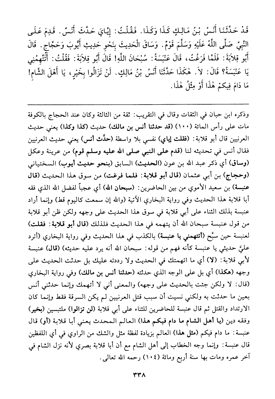 قَدْ حَدَّثَنَا أَنَسُ بْنُ مَالِكٍ كَذَا وَكَذَا. فَقُلْتُ: إِيَّايَ حَدَّثَ أَنَسٌ. قَدِمَ عَلَى النَّبِيِّ صَلَّى اللهُ عَلَيهِ وَسَلَّمَ قَوْمٌ. وَسَاقَ الْحَدِيثَ بِنَحْو حَدِيثِ أَيُّوبَ وَحَحَّاجٍ. قَال أَبُو قِلابَةَ: فَلَمَّا فَرَغْتُ، قَال عَنْبَسَةُ: سُبْحَانَ اللهِ! قَال أَبُو قِلابَةَ: فَقُلْتُ: أَتَتَّهِمُنِي يَا عَنْبَسَةُ؟ قَال: لَا. هكَذَا حَدَّثَنَا أَنَسُ بْنُ مَالِكٍ. لَنْ تَزَالُوا بِخَيرٍ، يَا أَهْلَ الشَّامِ! مَا دَامَ فِيكمْ هذَا أَوْ مِثْلُ هذَا