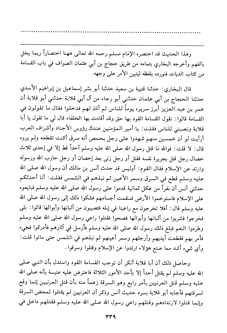 قال البخاري: حدثنا قتيبة بن سعيد حدثنا أبو بشر إسماعيل بن إبراهيم الأسدي حدثنا الحجاج بن أبي عثمان حدثني أبو رجاء من آل أبي قلابة حدثني أبو قلابة أن عمر بن عبد العزيز أبرز سريره يومًا للناس ثم أذن لهم فدخلوا فقال ما تقولون في القسامة قالوا: نقول القسامة القود بها حق وقد أقادت بها الخلفاء قال لي ما تقول يا أبا قلابة ونصبني للناس فقلت: يا أمير المؤمنين عندك رؤوس الأجناد وأشراف العرب أرأيت لو أن خمسين منهم شهدوا على رجل بحمص أنه سرق أكنت تقطعه ولم يروه قال: لا قلت: فوالله ما قتل رسول الله صلى الله عليه وسلم أحدًا قط إلا في إحدى ثلاث خصال رجل قتل بجريرة نفسه فقتل أو رجل زنى بعد إحصان أو رجل حارب الله ورسوله وارتد عن الإسلام فقال القوم: أوليس قد حدث أنس بن مالك أن رسول الله صلى الله عليه وسلم قطع في السرق وسمر الأعين ثم نبذهم في الشمس فقلت: أنا أحدثكم حدثني أنس أن نفرًا من عكل ثمانية قدموا على رسول الله صلى الله عليه وسلم فبايعوه على الإسلام فاستوخموا الأرض فسقمت أجسامهم فشكوا ذلك إلى رسول الله صلى الله عليه وسلم قال: أفلا تخرجون مع راعينا في إبله فتصيبون من ألبانها وأبوالها قالوا: بلى فخرجوا فشربوا من ألبانها وأبوالها فصحوا فقتلوا راعي رسول الله صلى الله عليه وسلم وطردوا النعم فبلغ ذلك رسول الله صلى الله عليه وسلم فأرسل في آثارهم فأدركوا فجيء فأمر بهم فقطعت أيديهم وأرجلهم وسمر أعينهم ثم نبذهم في الشمس حتى ماتوا قلت: وأي شيء أشد مما صنع هؤلاء ارتدوا عن الإسلام وقتلوا وسرقوا.