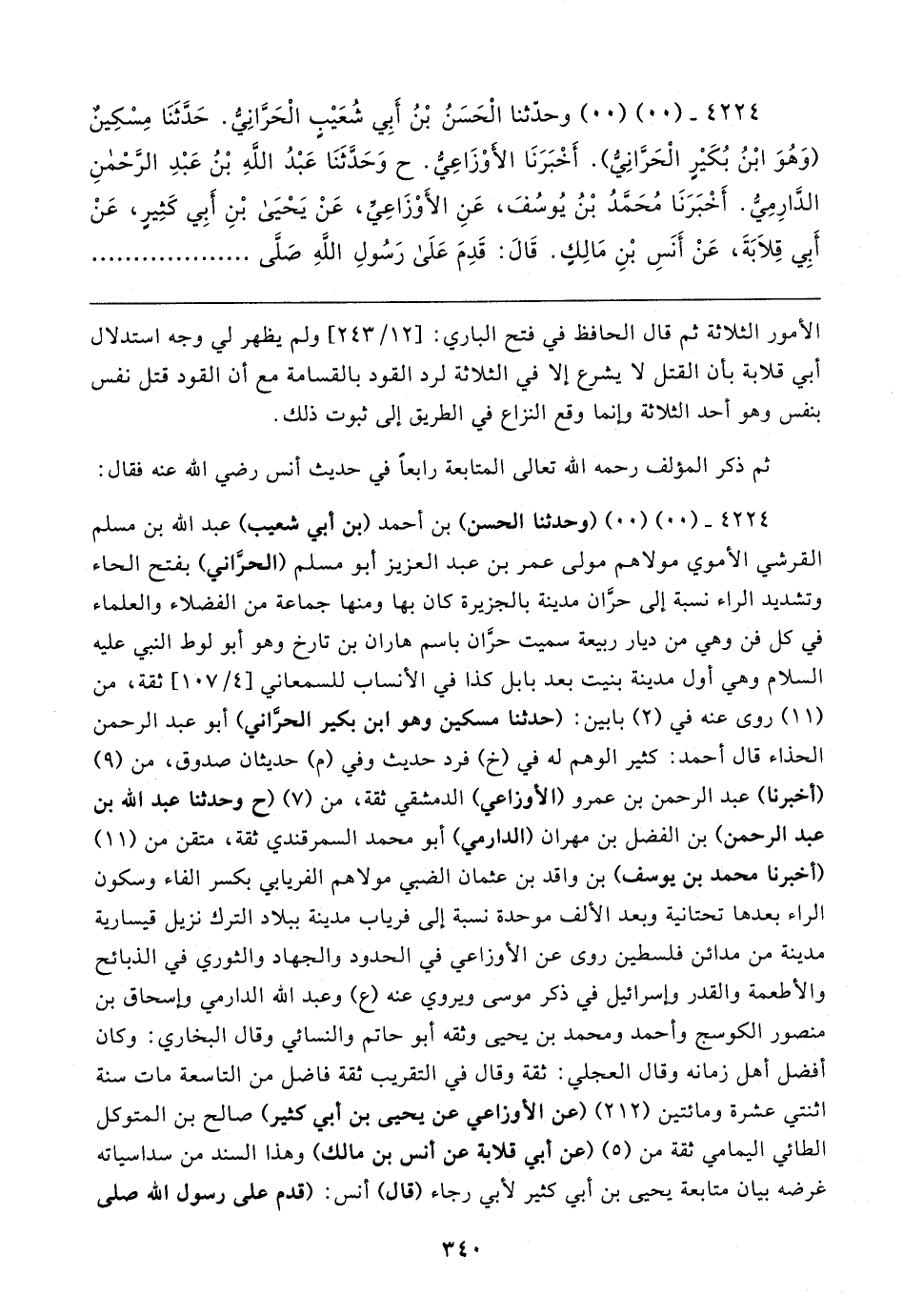 ٤٢٢٤ - (٠٠) (٠٠) (وحدثنا الحسن) بن أحمد (بن أبي شعيب) عبد الله بن مسلم القرشي الأموي مولاهم مولى عمر بن عبد العزيز أبو مسلم (الحرَّاني) بفتح الحاء وتشديد الراء نسبة إلى حرَّان مدينة بالجزيرة كان بها ومنها جماعة من الفضلاء والعلماء في كل فن وهي من ديار ربيعة سميت حرَّان باسم هاران بن تارخ وهو أبو لوط النبي عليه السلام وهي أول مدينة بنيت بعد بابل كذا في الأنساب للسمعاني [٤/ ١٠٧] ثقة، من (١١) روى عنه في (٢) بابين: (حدثنا مسكين وهو ابن بكير الحرَّاني) أبو عبد الرحمن الحذاء قال أحمد: كثير الوهم له في (خ) فرد حديث وفي (م) حديثان صدوق، من (٩) (أخبرنا) عبد الرحمن بن عمرو (الأوزاعي) الدمشقي ثقة، من (٧) (ح وحدثنا عبد الله بن عبد الرحمن) بن الفضل بن مهران (الدارمي) أبو محمد السمرقندي ثقة، متقن من (١١) (أخبرنا محمد بن يوسف) بن واقد بن عثمان الضبي مولاهم الفريابي بكسر الفاء وسكون الراء بعدها تحتانية وبعد الألف موحدة نسبة إلى فرياب مدينة ببلاد الترك نزيل قيسارية مدينة من مدائن فلسطين روى عن الأوزاعي في الحدود والجهاد والثوري في الذبائح والأطعمة والقدر وإسرائيل في ذكر موسى ويروي عنه (ع) وعبد الله الدارمي وإسحاق بن منصور الكوسج وأحمد ومحمد بن يحيى وثقه أبو حاتم والنسائي وقال البخاري: وكان أفضل أهل زمانه وقال العجلي: ثقة وقال في التقريب ثقة فاضل من التاسعة مات سنة اثنتي عشرة ومائتين (٢١٢) (عن الأوزاعي عن يحيى بن أبي كثير) صالح بن المتوكل الطائي اليمامي ثقة من (٥) (عن أبي قلابة عن أنس بن مالك) وهذا السند من سداسياته غرضه بيان متابعة يحيى بن أبي كثير لأبي رجاء (قال) أنس: (قدم على رسول الله صلى