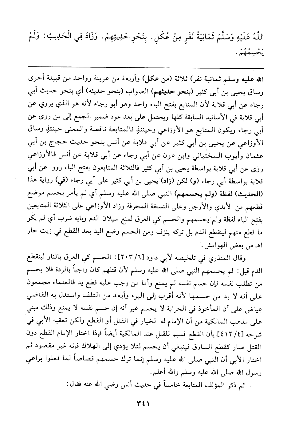 الله عليه وسلم ثمانية نفر) ثلاثة (من عكل) وأربعة من عرينة وواحد من قبيلة أخرى وساق يحيى بن أبي كثير (بنحو حديثهم) الصواب (بنحو حديثه) أي بنحو حديث أبي رجاء عن أبي قلابة لأن المتابع بفتح الباء واحد وهو أبو رجاء لأنه هو الذي يروي عن أبي قلابة في الأسانيد السابقة كلها ويحتمل على بعد عود ضمير الجمع إلى من روى عن أبي رجاء ويكون المتابع هو الأوزاعي وحينئذٍ فالمتابعة ناقصة والمعنى حينئذٍ وساق الأوزاعي عن يحيى بن أبي كثير عن أبي قلابة عن أنس بنحو حديث حجاج بن أبي عثمان وأيوب السختياني وابن عون عن أبي رجاء عن أبي قلابة عن أنس فالأوزاعي روى عن أبي قلابة بواسطة يحيى بن أبي كثير فالثلاثة المتابعون بفتح الباء رووا عن أبي قلابة بواسطة أبي رجاء (و) لكن (زاد) يحيى بن أبي كثير على أبي رجاء (في) رواية هذا (الحديث) لفظة (ولم يحسمهم) النبي صلى الله عليه وسلم أي لم يأمر بحسم موضع قطعهم من الأيدي والأرجل وعلى النسخة المحرفة وزاد الأوزاعي على الثلاثة المتابعين بفتح الباء لفظة ولم يحسمهم والحسم كي العرق لمنع سيلان الدم وبابه شرب أي لم يكو ما قطع منهم لينقطع الدم بل تركه ينزف ومن الحسم وضع اليد بعد القطع في زيت حار اهـ من بعض الهوامش.
