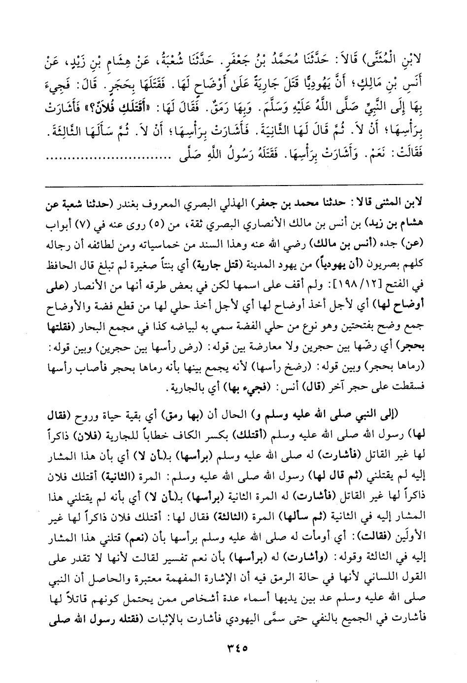 لابْنِ الْمُثَنَّى) قَالا: حَدَّثَنَا مُحَمَّدُ بْنُ جَعْفَرٍ. حَدَّثَنَا شُعْبَةُ، عَنْ هِشَامِ بْنِ زَيدٍ، عَنْ أَنَسِ بْنِ مَالِكٍ؛ أَنَّ يَهُودِيًّا قَتَلَ جَارِيَةً عَلَى أَوْضَاحٍ لَهَا. فَقَتَلَهَا بِحَجَرٍ. قَال: فَجِيءَ بِهَا إِلَى النَّبِيّ صَلَّى اللَّهُ عَلَيهِ وَسَلَّمَ. وَبِهَا رَمَقٌ. فَقَال لَهَا: "أَقَتَلَكِ فُلانٌ؟ ! فَأَشَارَتْ بِرَأْسِهَا؛ أَنْ لَا. ثُمَّ قَال لَهَا الثَّانِيَةَ. فَأَشَارَتْ بِرَأْسِهَا؛ أَنْ لَا. ثُمَّ سَالهَا الثَّالِثَةَ. فَقَالتْ: نَعَمْ. وَأَشَارَتْ بِرَأْسِهَا. فَقَتَلَهُ رَسُولُ اللهِ صَلَّى
