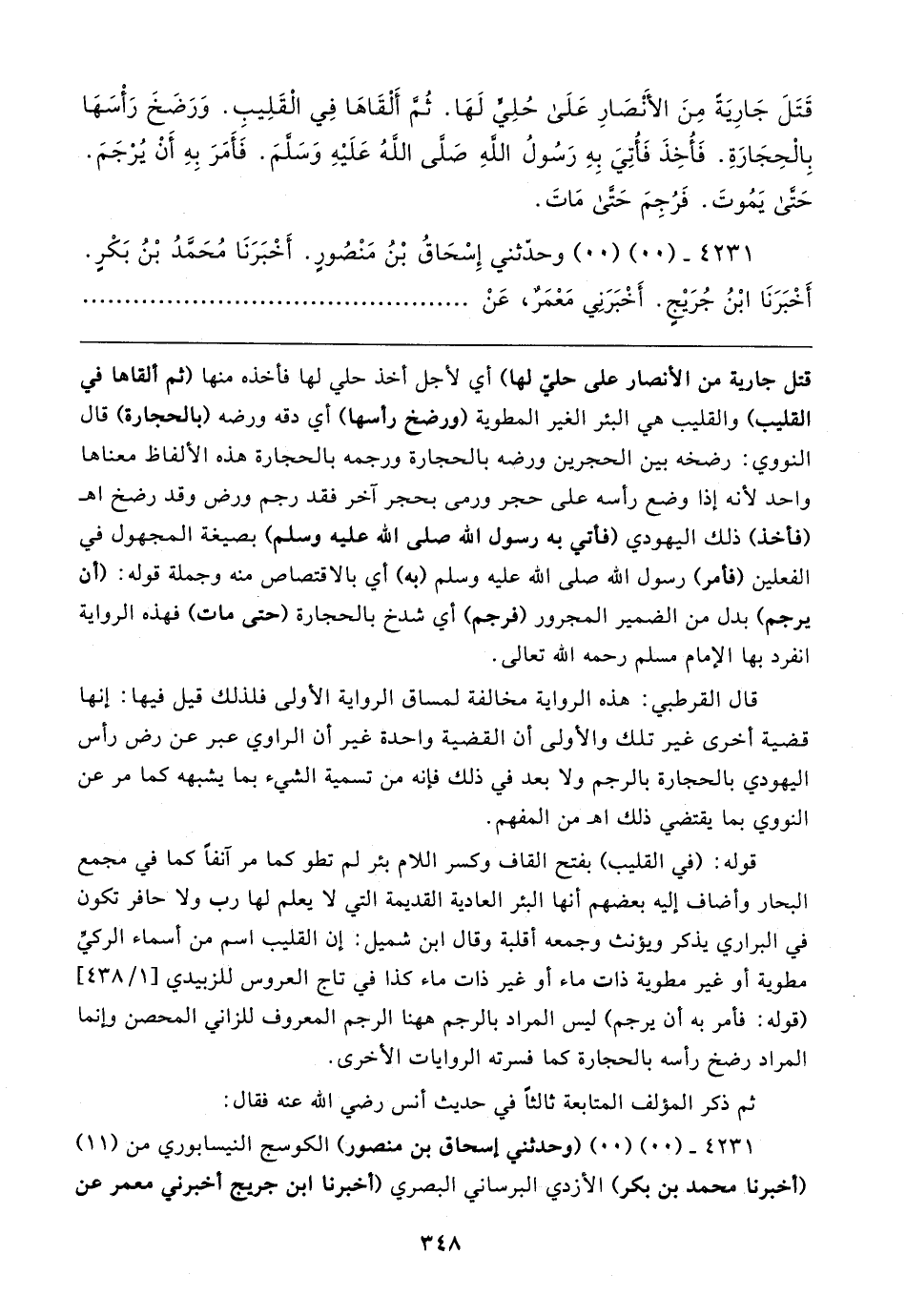 قتل جارية من الأنصار على حليّ لها) أي لأجل أخذ حلي لها فأخذه منها (ثم ألقاها في القليب) والقليب هي البئر الغير المطوية (ورضخ رأسها) أي دقه ورضه (بالحجارة) قال النووي: رضخه بين الحجرين ورضه بالحجارة ورجمه بالحجارة هذه الألفاظ معناها واحد لأنه إذا وضع رأسه على حجر ورمى بحجر آخر فقد رجم ورض وقد رضخ اهـ (فأخذ) ذلك اليهودي (فأتي به رسول الله صلى الله عليه وسلم) بصيغة المجهول في الفعلين (فأمر) رسول الله صلى الله عليه وسلم (به) أي بالاقتصاص منه وجملة قوله: (أن يرجم) بدل من الضمير المجرور (فرجم) أي شدخ بالحجارة (حتى مات) فهذه الرواية انفرد بها الإمام مسلم رحمه الله تعالى.