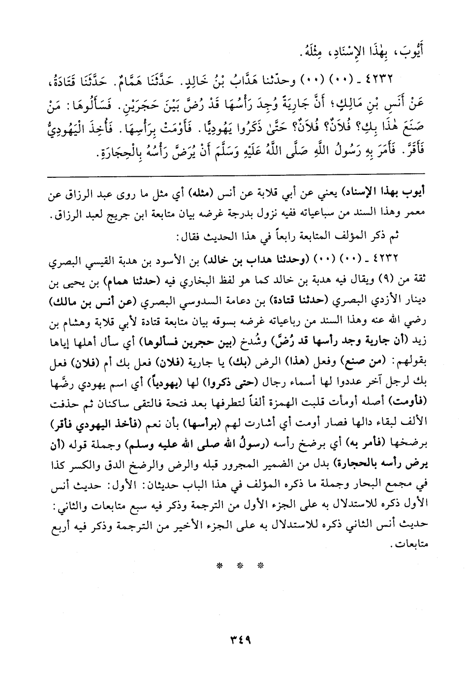 ٤٢٣٢ - (٠٠) (٠٠) (وحدثنا هداب بن خالد) بن الأسود بن هدبة القيسي البصري ثقة من (٩) ويقال فيه هدبة بن خالد كما هو لفظ البخاري فيه (حدثنا همام) بن يحيى بن دينار الأزدي البصري (حدثنا قتادة) بن دعامة السدوسي البصري (عن أنس بن مالك) رضي الله عنه وهذا السند من رباعياته غرضه بسوقه بيان متابعة قتادة لأبي قلابة وهشام بن زيد (أن جارية وجد رأسها قد رُضَّ) وشُدخ (بين حجرين فسألوها) أي سأل أهلها إياها بقولهم: (من صنع) وفعل (هذا) الرض (بك) يا جارية (فلان) فعل بك أم (فلان) فعل بك لرجل آخر عددوا لها أسماء رجال (حتى ذكروا) لها (يهوديًّا) أي اسم يهودي رضَّها (فأومت) أصله أومأت قلبت الهمزة ألفًا لتطرفها بعد فتحة فالتقى ساكنان ثم حذفت الألف لبقاء دالها فصار أومت أي أشارت لهم (برأسها) بأن نعم (فأخذ اليهودي فأقر) برضخها (فأمر به) أي برضخ رأسه (رسولُ الله صلى الله عليه وسلم) وجملة قوله (أن يرض رأسه بالحجارة) بدل من الضمير المجرور قبله والرض والرضخ الدق والكسر كذا في مجمع البحار وجملة ما ذكره المؤلف في هذا الباب حديثان: الأول: حديث أنس الأول ذكره للاستدلال به على الجزء الأول من الترجمة وذكر فيه سبع متابعات والثاني: حديث أنس الثاني ذكره للاستدلال به على الجزء الأخير من الترجمة وذكر فيه أربع متابعات.