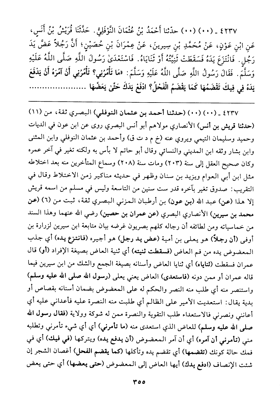 ٤٢٣٧ - (٠٠) (٠٠) (حدثنا أحمد بن عثمان النوفلي) البصري ثقة، من (١١) (حدثنا قريش بن أنس) الأنصاري مولاهم أبو أنس البصري روى عن ابن عون في الديات وحميد وسليمان التيمي ويروي عنه (خ م د ت ق) وأحمد بن عثمان النوفلي وابن المثنى وابن بشار وثقه ابن المديني والنسائي وقال أبو حاتم لا بأس به ولكنه تغير في آخر عمره وكان صحيح العقل إلى سنة (٢٠٣) ومات سنة (٢٠٨) وسماع المتأخرين منه بعد اختلاطه مثل ابن أبي العوام ويزيد بن سنان وظهر في حديثه مناكير زمن الاختلاط وقال في التقريب: صدوق تغير بآخره قدر ست سنين من التاسعة وليس في مسلم من اسمه قريش إلا هذا (عن) عبد الله (بن عون) بن أرطبان المزني البصري ثقة، ثبت من (٦) (عن محمد بن سيرين) الأنصاري البصري (عن عمران بن حصين) رضي الله عنهما وهذا السند من خماسياته ومن لطائفه أن رجاله كلهم بصريون غرضه بيان متابعة ابن سيرين لزرارة بن أوفى (أن رجلًا) هو يعلى بن أمية (عض يد رجل) هو أجيره (فانتزع يده) أي جذب المعضوض يده من فم العاض (فسقطت ثنيته) أي ثنية العاض بصيغة الإفراد (أو) قال عمران فسقطت (ثناياه) أي ثنايا العاض وأسنانه بصيغة الجمع والشك من ابن سيرين فيما قاله عمران أو ممن دونه (فاستعدى) العاض يعني يعلى (رسول الله صلى الله عليه وسلم) واستنصر منه أي طلب منه النصر والحكم له على المعضوض بضمان أسنانه بقصاص أو بدية يقال: استعديت الأمير على الظالم أي طلبت منه النصرة عليه فأعداني عليه أي أعانني ونصرني فالاستعداء طلب التقوية والنصرة ممن له شوكة وولاية (فقال رسول الله صلى الله عليه وسلم) للعاض الذي استعدى منه (ما تأمرني) أي أي شيء تأمرني وتطلبه مني (تأمرني أن آمره) أي أن آمر المعضوض (أن يدفع يده) ويتركها (في فيك) أي في فمك حالة كونك (تقضمها) أي تقضم يده وتأكلها (كما يقضم الفحل) أغصان الشجر إن شئت الإنصاف (ادفع يدك) أيها العاض إلى المعضوض (حتى يعضها) أي حتى يعض