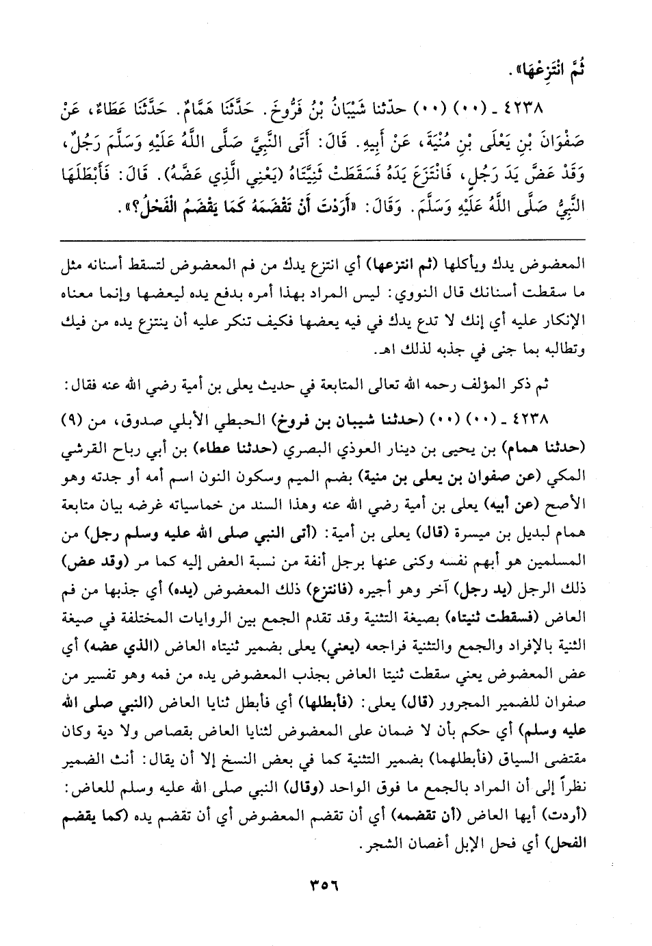 ٤٢٣٨ - (٠٠) (٠٠) (حدثنا شيبان بن فروخ) الحبطي الأبلي صدوق، من (٩) (حدثنا همام) بن يحيى بن دينار العوذي البصري (حدثنا عطاء) بن أبي رباح القرشي المكي (عن صفوان بن يعلى بن منية) بضم الميم وسكون النون اسم أمه أو جدته وهو الأصح (عن أبيه) يعلى بن أمية رضي الله عنه وهذا السند من خماسياته غرضه بيان متابعة همام لبديل بن ميسرة (قال) يعلى بن أمية: (أتى النبي صلى الله عليه وسلم رجل) من المسلمين هو أبهم نفسه وكنى عنها برجل أنفة من نسبة العض إليه كما مر (وقد عض) ذلك الرجل (يد رجل) آخر وهو أجيره (فانتزع) ذلك المعضوض (يده) أي جذبها من فم العاض (فسقطت ثنيتاه) بصيغة التثنية وقد تقدم الجمع بين الروايات المختلفة في صيغة الثنية بالإفراد والجمع والتثنية فراجعه (يعني) يعلى بضمير ثنيتاه العاض (الذي عضه) أي عض المعضوض يعني سقطت ثنيتا العاض بجذب المعضوض يده من فمه وهو تفسير من صفوان للضمير المجرور (قال) يعلى: (فأبطلها) أي فأبطل ثنايا العاض (النبي صلى الله عليه وسلم) أي حكم بأن لا ضمان على المعضوض لثنايا العاض بقصاص ولا دية وكان مقتضى السياق (فأبطلهما) بضمير التثنية كما في بعض النسخ إلا أن يقال: أنث الضمير نظرًا إلى أن المراد بالجمع ما فوق الواحد (وقال) النبي صلى الله عليه وسلم للعاض: (أردت) أيها العاض (أن تقضمه) أي أن تقضم المعضوض أي أن تقضم يده كما يقضم الفحل) أي فحل الإبل أغصان الشجر.