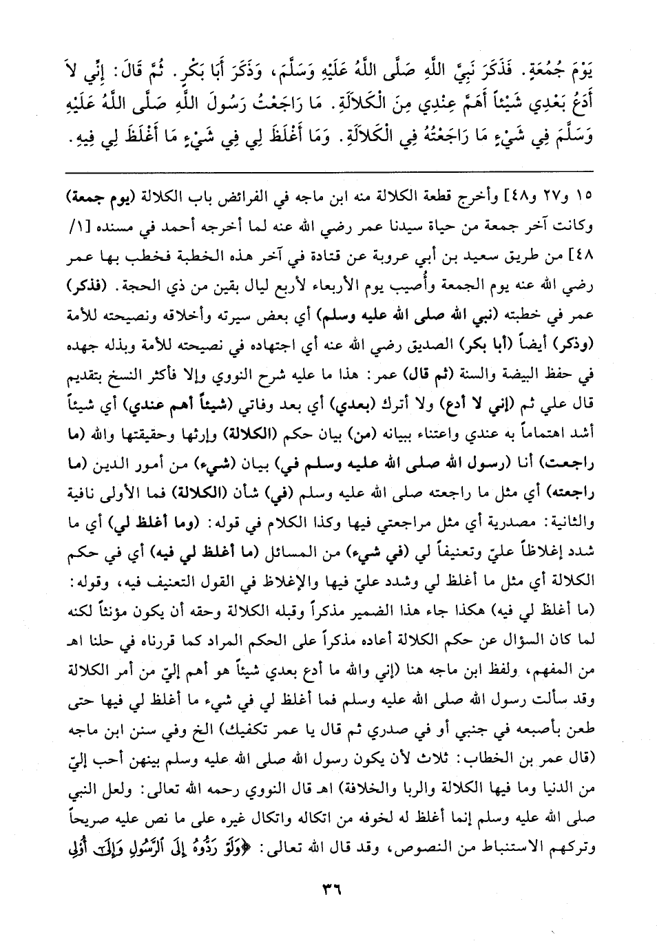 ١٥ و ٢٧ و ٤٨] وأخرج قطعة الكلالة منه ابن ماجه في الفرائض باب الكلالة (يوم جمعة) وكانت آخر جمعة من حياة سيدنا عمر رضي الله عنه لما أخرجه أحمد في مسنده [١/ ٤٨، من طريق سعيد بن أبي عروبة عن قتادة في آخر هذه الخطبة فخطب بها عمر رضي الله عنه يوم الجمعة وأُصيب يوم الأربعاء لأربع ليال بقين من ذي الحجة. (فذكر) عمر في خطبته (نبي الله صلى الله عليه وسلم) أي بعض سيرته وأخلاقه ونصيحته للأمة (وذكر) أيضًا (أبا بكر) الصديق رضي الله عنه أي اجتهاده في نصيحته للأمة وبذله جهده في حفظ البيضة والسنة (ثم قال) عمر: هذا ما عليه شرح النووي وإلا فأكثر النسخ بتقديم قال علي ثم (إني لا أدع) ولا أترك (بعدي) أي بعد وفاتي (شيئًا أهم عندي) أي شيئًا أشد اهتمامًا به عندي واعتناء ببيانه (من) بيان حكم (الكلالة) وإرثها وحقيقتها والله (ما راجعت) أنا (رسول الله صلى الله عليه وسلم في) بيان (شيء) من أمور الدين (ما راجعته) أي مثل ما راجعته صلى الله عليه وسلم (في) شأن (الكلالة) فما الأولى نافية والثانية: مصدرية أي مثل مراجعتي فيها وكذا الكلام في قوله: (وما أغلظ لي) أي ما شدد إغلاظًا عليّ وتعنيفًا لي (في شيء) من المسائل (ما أغلظ لي فيه) أي في حكم الكلالة أي مثل ما أغلظ لي وشدد عليّ فيها والإغلاظ في القول التعنيف فيه، وقوله: (ما أغلظ لي فيه) هكذا جاء هذا الضمير مذكرًا وقبله الكلالة وحقه أن يكون مؤنثًا لكنه لما كان السؤال عن حكم الكلالة أعاده مذكرًا على الحكم المراد كما قررناه في حلنا اهـ من المفهم، ولفظ ابن ماجه هنا (إني والله ما أدع بعدي شيئًا هو أهم إليّ من أمر الكلالة وقد سألت رسول الله صلى الله عليه وسلم فما أغلظ لي في شيء ما أغلظ لي فيها حتى طعن بأصبعه في جنبي أو في صدري ثم قال يا عمر تكفيك) الخ وفي سنن ابن ماجه (قال عمر بن الخطاب: ثلاث لأن يكون رسول الله صلى الله عليه وسلم بينهن أحب إليّ من الدنيا وما فيها الكلالة والربا والخلافة) اهـ قال النووي رحمه الله تعالى: ولعل النبي صلى الله عليه وسلم إنما أغلظ له لخوفه من اتكاله واتكال غيره على ما نص عليه صريحًا وتركهم الاستنباط من النصوص، وقد قال الله تعالى: {وَلَوْ رَدُّوهُ إِلَى الرَّسُولِ وَإِلَى أُولِي