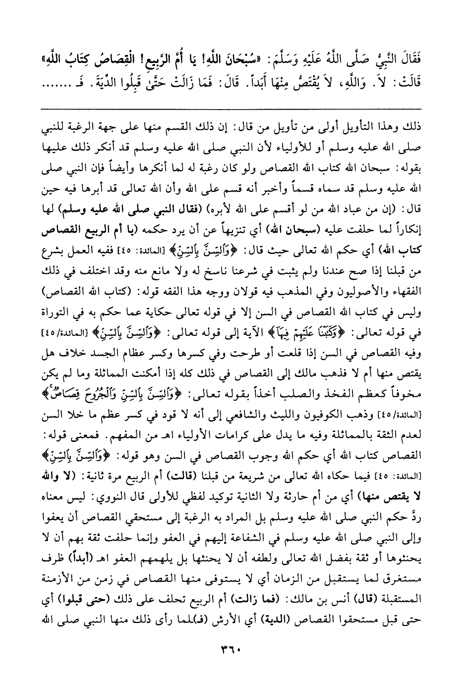 فَقَال النَّبِي صلَّى اللهُ عَلَيهِ وَسَلَّمَ: "سُبحَانَ اللهِ! يَا أُمَّ الرَّبِيعِ! الْقِصَاصُ كِتَابُ اللهِ" قَالتْ: لَا. وَاللهِ، لَا يُقْتَصُّ مِنْهَا ابَدًا. قَال: فَمَا زَالتْ حَتَّى قَبِلُوا الدِّيَةَ. فَـ