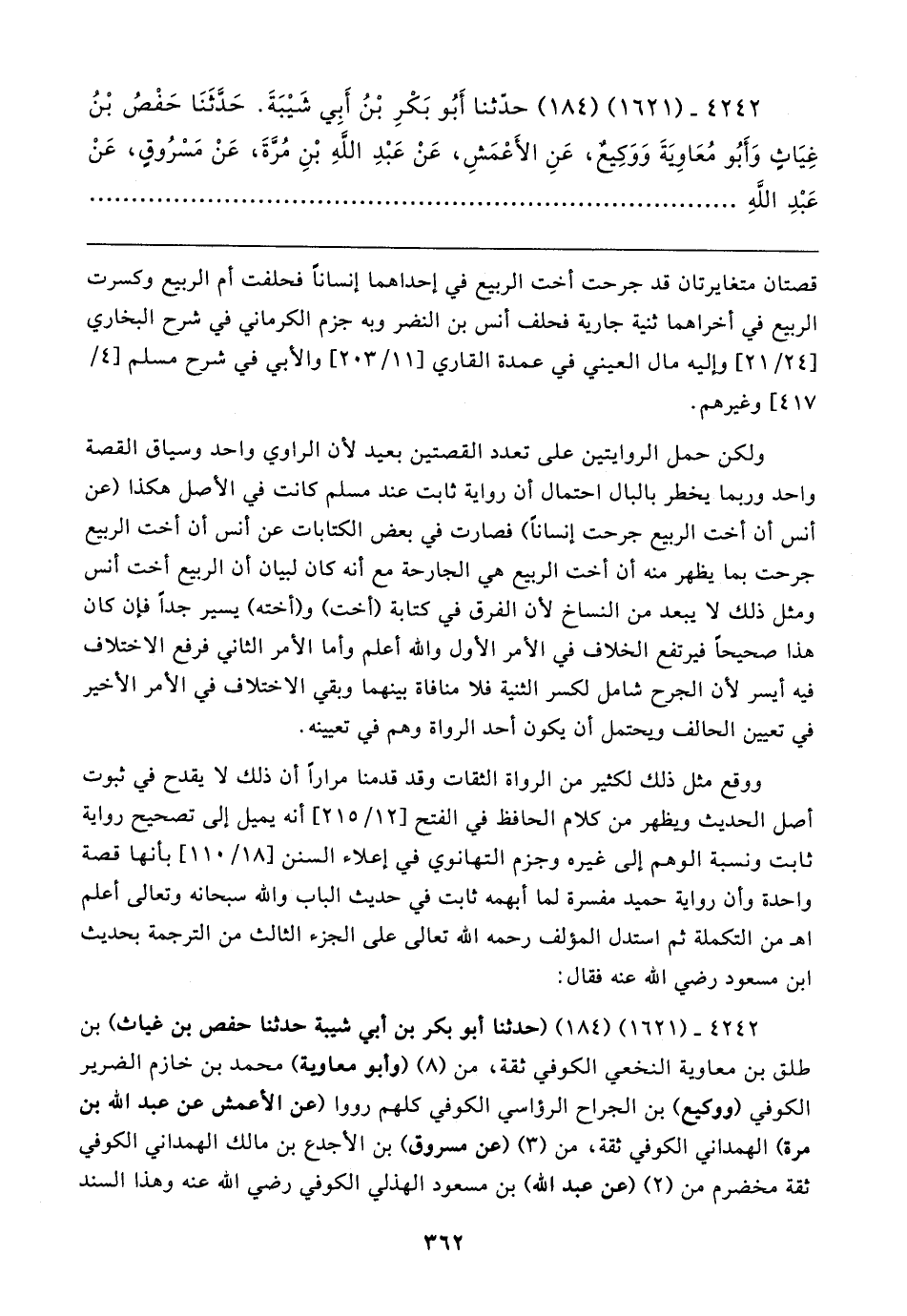 ٤٢٤٢ - (١٦٢١) (١٨٤) (حدثنا أبو بكر بن أبي شيبة حدثنا حفص بن غياث) بن طلق بن معاوية النخعي الكوفي ثقة، من (٨) (وأبو معاوية) محمد بن خازم الضرير الكوفي (ووكيع) بن الجراح الرؤاسي الكوفي كلهم رووا (عن الأعمش عن عبد الله بن مرة) الهمداني الكوفي ثقة، من (٣) (عن مسروق) بن الأجدع بن مالك الهمداني الكوفي ثقة مخضرم من (٢) (عن عبد الله) بن مسعود الهذلي الكوفي رضي الله عنه وهذا السند