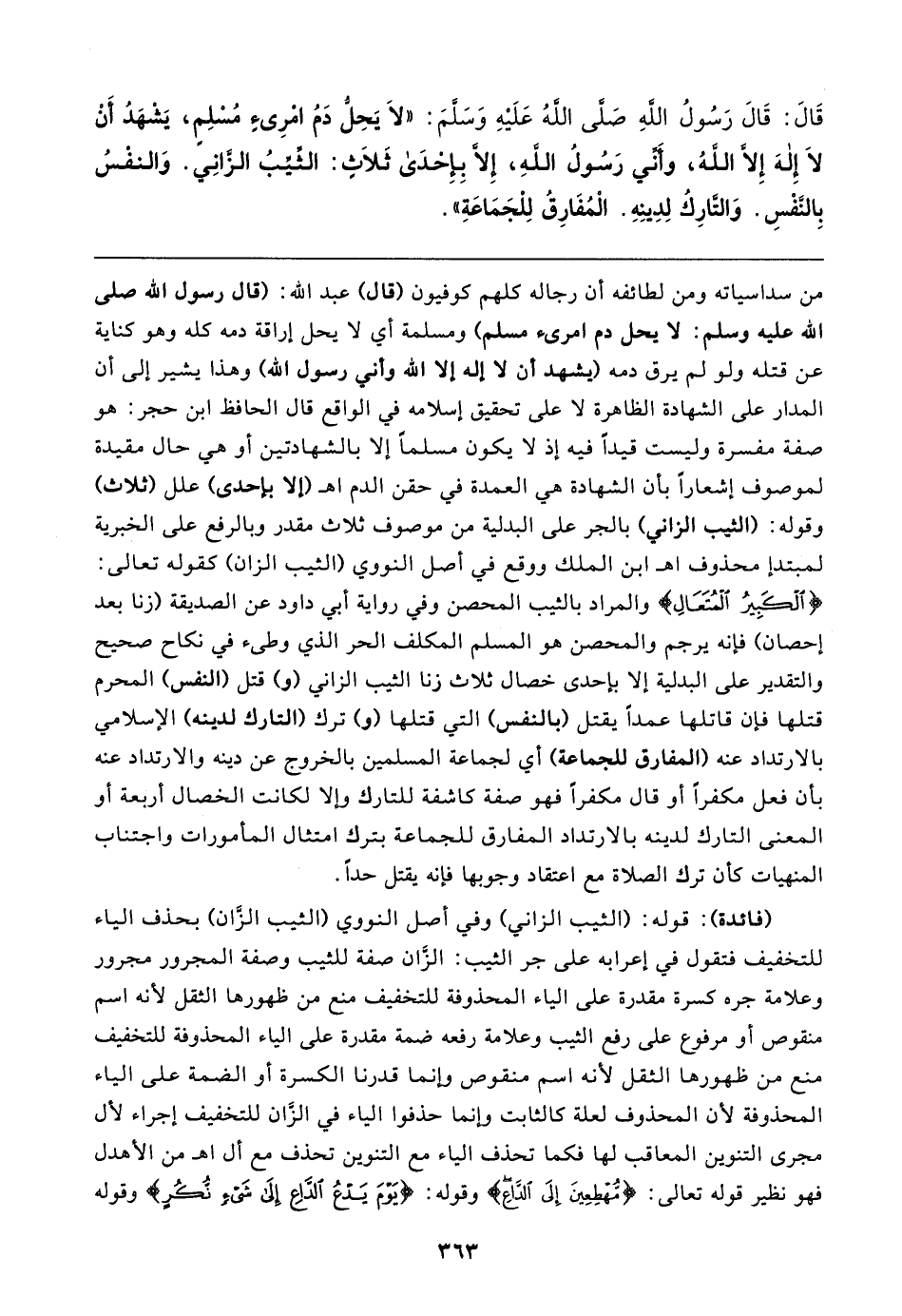 قَال: قَال رَسُولُ اللهِ صَلَّى اللهُ عَلَيهِ وَسَلَّمَ: "لَا يَحِلُّ دَمُ امْرِئٍ مُسْلِمٍ، يَشْهَدُ أَنْ لَا إِلهَ إِلَّا اللهُ، وأَنِّي رَسُولُ اللهِ، إِلَّا بِإِحْدَى ثَلاثٍ: الثِّيِّبُ الزَّانِي. وَالنفْسُ بِالنَّفْسِ. وَالتَّارِكُ لِدِينِهِ. الْمُفَارِقُ لِلْجَمَاعَةِ"