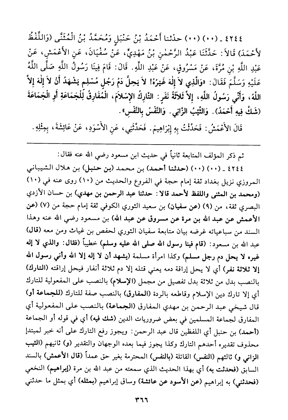 ٤٢٤٤ - (٠٠) (٠٠) حدَّثنا أَحْمَدُ بْنُ حَنْبَلٍ وَمُحَمَّدُ بْنُ الْمُثَنَّى (وَاللَّفْظُ لأَحْمَدَ) قَالا: حَدَّثَنَا عَبْدُ الرَّحْمنِ بْنُ مَهْدِيٍّ، عَنْ سُفْيَانَ، عَنِ الأَعْمَشِ، عَنْ عَبْدِ اللهِ بْنِ مُرَّةَ، عَنْ مَسْرُوقٍ، عَنْ عَبْدِ اللهِ. قَال: قَامَ فِينَا رَسُولُ اللهِ صَلَّى اللهُ عَلَيهِ وَسَلَّمَ فَقَال: "وَالَّذِي لَا إِلهَ غَيرُهُ! لَا يَحِلُّ دَمُ رَجُلٍ مُسْلِمٍ يَشْهَدُ أَنْ لَا إِلهَ إِلَّا اللهُ، وَأَنِّي رَسُولُ اللهِ، إِلَّا ثَلاثةُ نَفَرٍ: التَّارِكُ الإِسْلامَ، الْمُفَارِقُ لِلْجَمَاعَةِ أَو الْجَمَاعَةَ (شَكَّ فِيهِ أَحْمَدُ). وَالثِّيِّبُ الزَّانِي. وَالنَّفْسُ بِالنَّفْسِ".