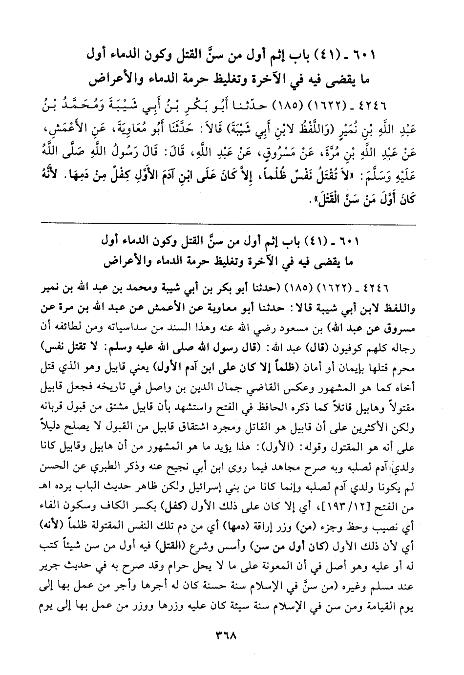 ٤٢٤٦ - (١٦٢٢) (١٨٥) حدَّثنا أَبُو بَكْرِ بْنُ أَبِي شَيبَةَ وَمُحَمَّدُ بْنُ عَبْدِ اللهِ بْنِ نُمَيرٍ (وَاللَّفْظُ لابْنِ أَبِي شَيبَةَ) قَالا: حَدَّثَنَا أَبُو مُعَاويةَ، عَنِ الأَعْمَشِ، عَنْ عَبْدِ اللهِ بْنِ مُرَّةَ، عَنْ مَسْرُوقٍ، عَنْ عَبْدِ اللهِ، قَال: قَال رَسُولُ اللهِ صَلَّى اللَّهُ عَلَيهِ وَسَلَّمَ: "لَا تُقْتَلُ نَفْسٌ ظُلْمًا، إِلَّا كَانَ عَلَى ابْنِ آدمَ الأَوَّلِ كِفْلٌ مِنْ دَمِهَا. لأَنَّهُ كَانَ أَوَّلَ مَنْ سَنَّ الْقَتْلَ"