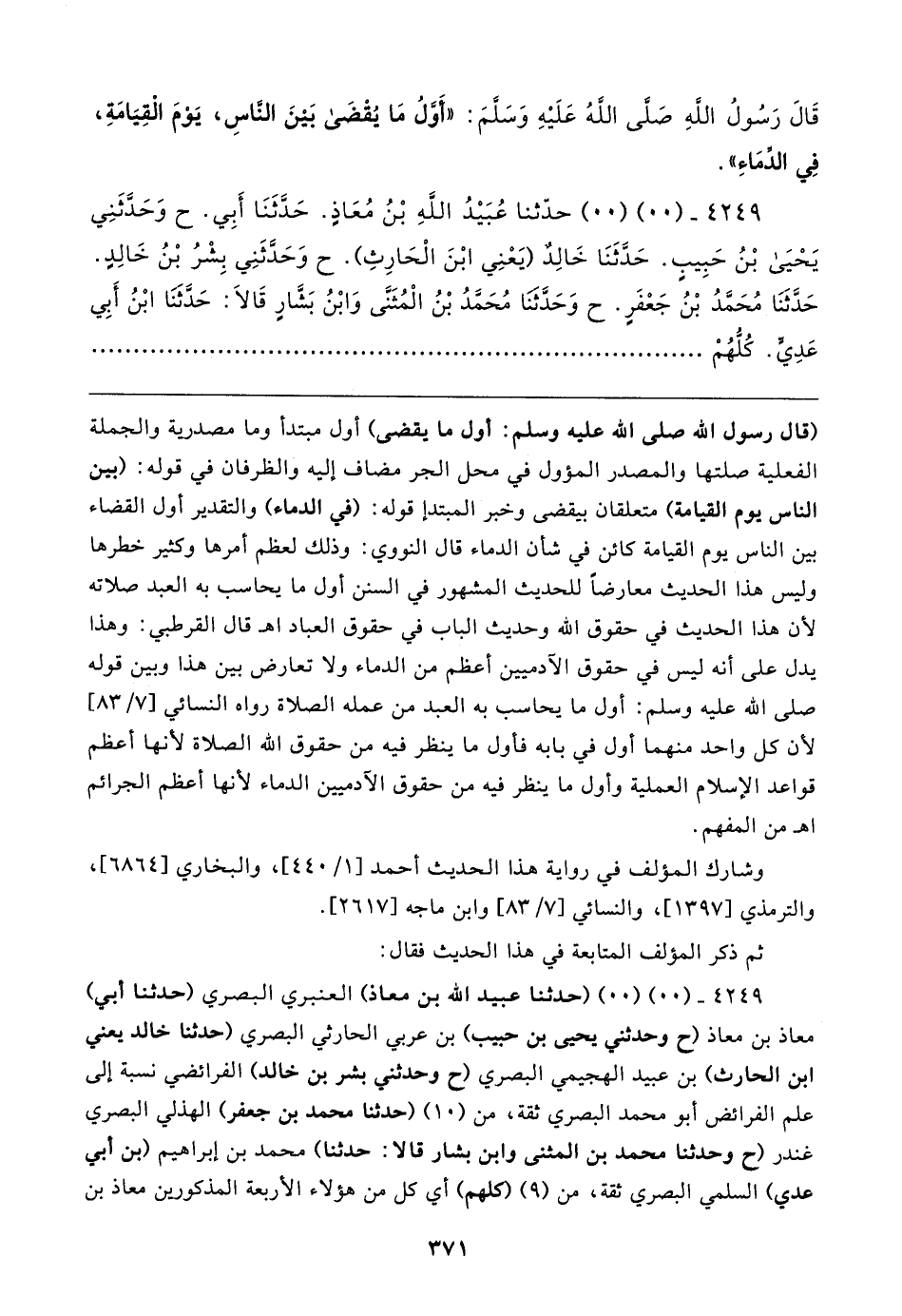 (قال رسول الله صلى الله عليه وسلم: أول ما يقضى) أول مبتدأ وما مصدرية والجملة الفعلية صلتها والمصدر المؤول في محل الجر مضاف إليه والظرفان في قوله: (بين النَّاس يوم القيامة) متعلقان بيقضى وخبر المبتدإ قوله: (في الدماء) والتقدير أول القضاء بين النَّاس يوم القيامة كائن في شأن الدماء قال النووي: وذلك لعظم أمرها وكثير خطرها وليس هذا الحديث معارضًا للحديث المشهور في السنن أول ما يحاسب به العبد صلاته لأن هذا الحديث في حقوق الله وحديث الباب في حقوق العباد اهـ قال القرطبي: وهذا يدل على أنَّه ليس في حقوق الآدميين أعظم من الدماء ولا تعارض بين هذا وبين قوله صلى الله عليه وسلم: أول ما يحاسب به العبد من عمله الصلاة رواه النَّسائيّ [٧/ ٨٣] لأن كل واحد منهما أول في بابه فأول ما ينظر فيه من حقوق الله الصلاة لأنها أعظم قواعد الإِسلام العملية وأول ما ينظر فيه من حقوق الآدميين الدماء لأنها أعظم الجرائم اهـ من المفهم.