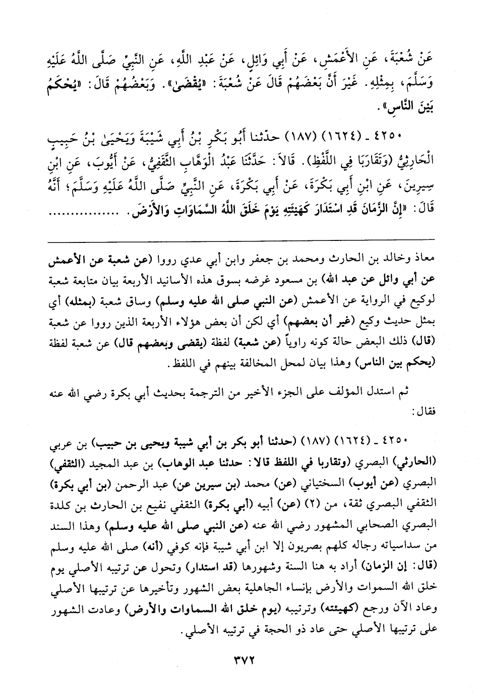 ٤٢٥٠ - (١٦٢٤) (١٨٧) حدَّثنا أَبُو بَكْرِ بْنُ أَبِي شَيبَةَ وَيَحْيَى بْنُ حَبِيبٍ الْحَارِثِيُّ (وَتَقَارَبَا في اللَّفْظِ). قَالا: حَدَّثنَا عَبْدُ الْوَهَّابِ الثَّقَفِيُّ، عَنْ أَيُّوبَ، عَنِ ابْنِ سِيرِينَ، عَنِ ابْنِ أَبِي بَكْرَةَ، عَنْ أَبِي بَكْرَةَ، عَنِ النَّبِيّ صَلَّى اللهُ عَلَيهِ وسلَّمَ؛ أَنَّهُ قَال: "إِنَّ الزَّمَانَ قَدِ اسْتَدَارَ كَهَيئَتِهِ يَومَ خَلَقَ اللهُ السَّمَاوَاتِ وَالأرضَ