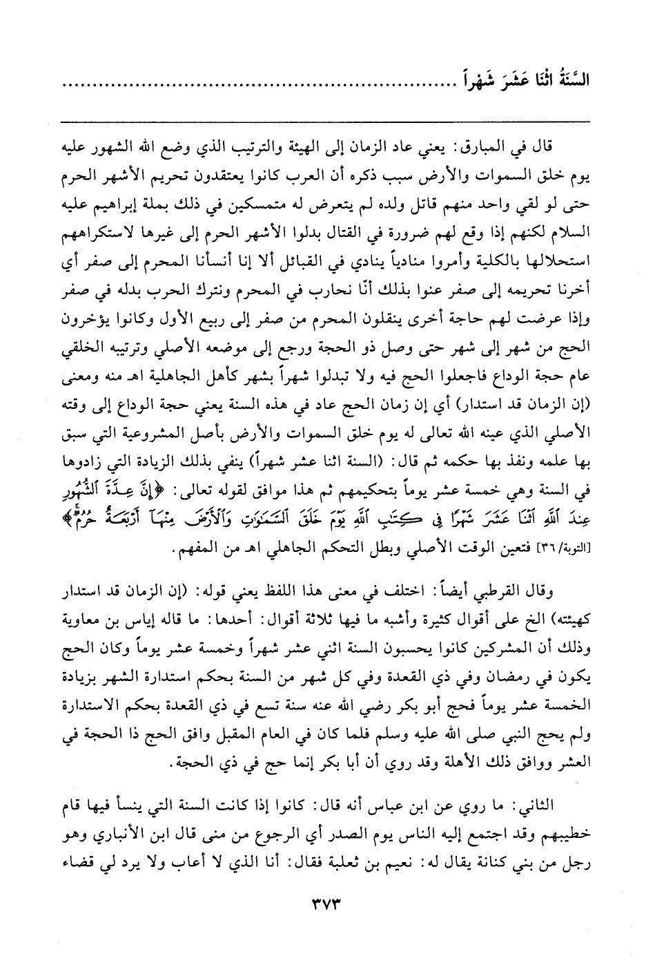 وقال القرطبي أَيضًا: اختلف في معنى هذا اللفظ يعني قوله: (إن الزمان قد استدار كهيئته) الخ على أقوال كثيرة وأشبه ما فيها ثلاثة أقوال: أحدها: ما قاله إياس بن معاوية وذلك أن المشركين كانوا يحسبون السنة اثني عشر شهرًا وخمسة عشر يومًا وكان الحج يكون في رمضان وفي ذي القعدة وفي كل شهر من السنة بحكم استدارة الشهر بزيادة الخمسة عشر يومًا فحج أبو بكر رضي الله عنه سنة تسع في ذي القعدة بحكم الاستدارة ولم يحج النَّبِيّ صلى الله عليه وسلم فلما كان في العام المقبل وافق الحج ذا الحجة في العشر ووافق ذلك الأهلة وقد روي أن أَبا بكر إنما حج في ذي الحجة.