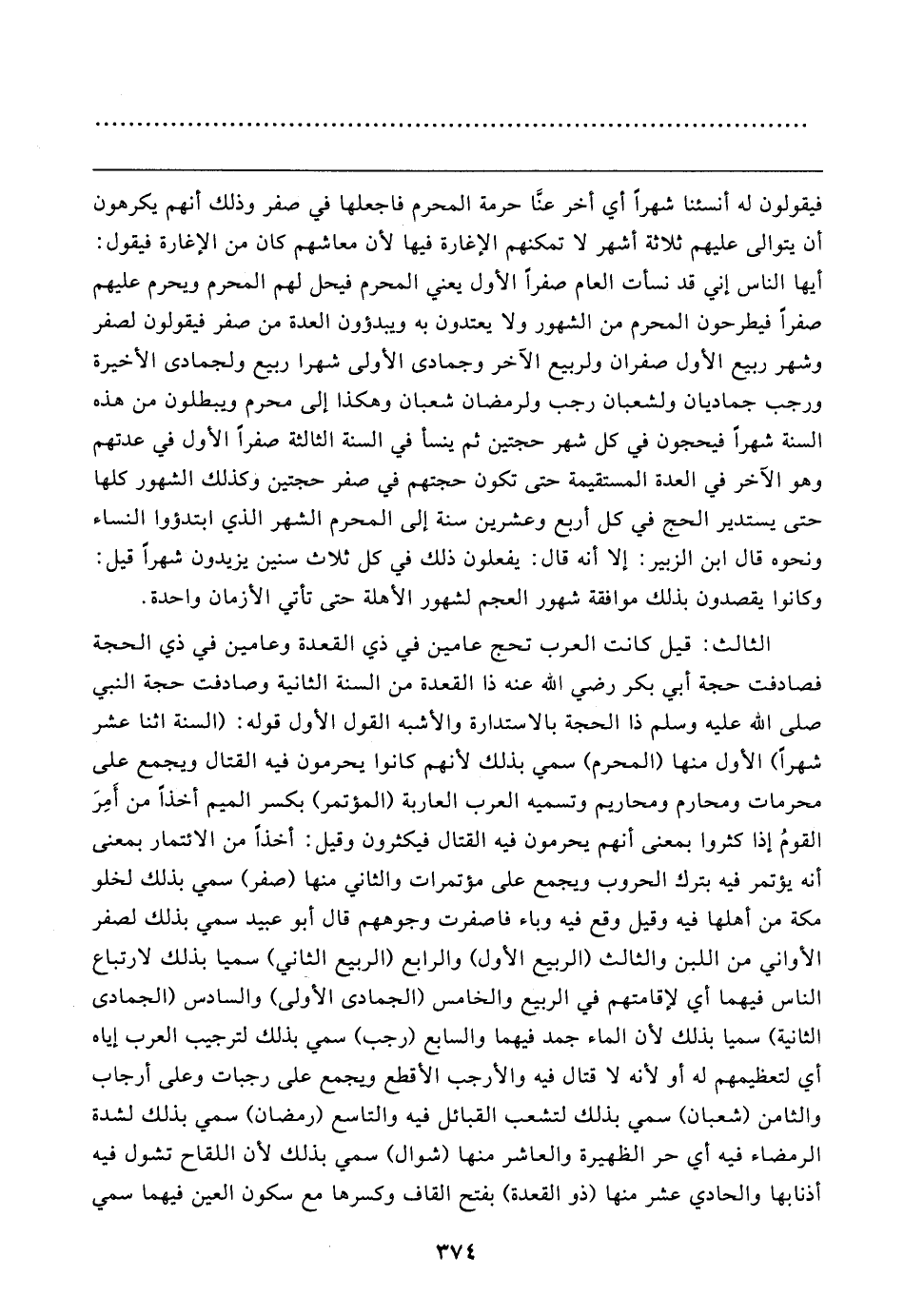 فيقولون له أنسئنا شهرًا أي أخر عنَّا حرمة المحرم فاجعلها في صفر وذلك أنَّهم يكرهون أن يتوالى عليهم ثلاثة أشهر لا تمكنهم الإغارة فيها لأن معاشهم كان من الإغارة فيقول: أيها النَّاس إنِّي قد نسأت العام صفرًا الأول يعني المحرم فيحل لهم المحرم ويحرم عليهم صفرًا فيطرحون المحرم من المشهور ولا يعتدون به ويبدؤون العدة من صفر فيقولون لصفر وشهر ربيع الأول صفران ولربيع الآخر وجمادى الأولى شهرًا ربيع ولجمادى الأخيرة ورجب جماديان ولشعبان رجب ولرمضان شعبان وهكذا إلى محرم ويبطلون من هذه السنة شهرًا فيحجون في كل شهر حجتين ثم ينسأ في السنة الثالثة صفرًا الأول في عدتهم وهو الآخر في العدة المستقيمة حتَّى تكون حجتهم في صفر حجتين وكذلك المشهور كلها حتَّى يستدير الحج في كل أربع وعشرين سنة إلى المحرم الشهر الذي ابتدؤوا النساء ونحوه قال ابن الزُّبير: إلَّا أنَّه قال: يفعلون ذلك في كل ثلاث سنين يزيدون شهرًا قيل: وكانوا يقصدون بذلك موافقة شهور العجم لشهور الأهلة حتَّى تأتي الأزمان واحدة.