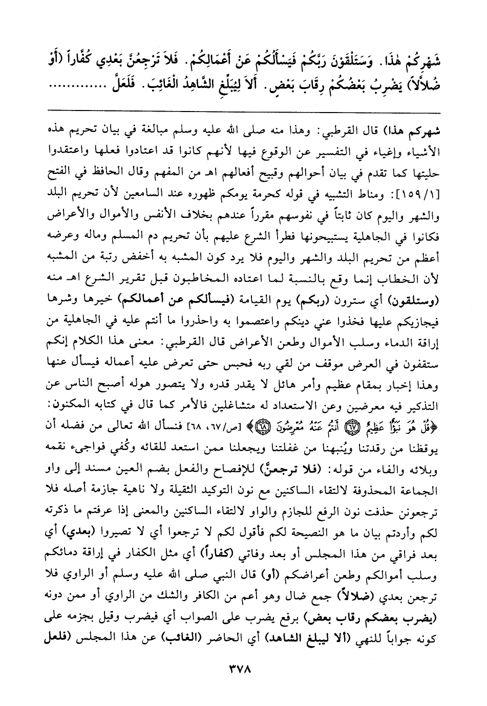 شَهْرِكُمْ هذَا. وَسَتَلْقَوْنَ رَبَّكُمْ فَيَسْأَلُكُمْ عَنْ أَعْمَالِكُمْ. فَلَا تَرْجِعُنَّ بَعْدِي كفارًا (أَوْ ضُلَّالًا) يَضْرِبُ بَعْضُكُمْ رِقَابَ بَعْضٍ. أَلَا لِيُبَلِّغِ الشَّاهِدُ الْغَائِبَ. فَلَعَلَّ
