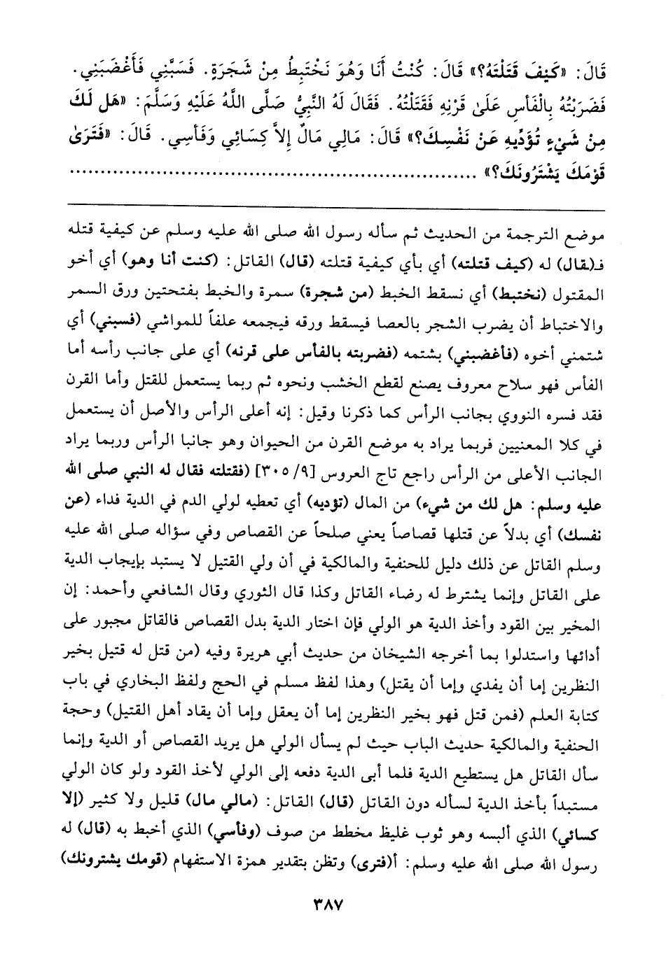 موضع الترجمة من الحديث ثم سأله رسول الله صلى الله عليه وسلم عن كيفية قتله فـ (ـقال) له (كيف قتلته) أي بأي كيفية قتلته (قال) القاتل: (كنت أنا وهو) أي أخو المقتول (نختبط) أي نسقط الخبط (من شجرة) سمرة والخبط بفتحتين ورق السمر والاختباط أن يضرب الشجر بالعصا فيسقط ورقه فيجمعه علفًا للمواشي (فسبني) أي شتمني أخوه (فأغضبني) بشتمه (فضربته بالفأس على قرنه) أي على جانب رأسه أما الفأس فهو سلاح معروف يصنع لقطع الخشب ونحوه ثم ربما يستعمل للقتل وأما القرن فقد فسره النووي بجانب الرأس كما ذكرنا وقيل: إنه أعلى الرأس والأصل أن يستعمل في كلا المعنيين فربما يراد به موضع القرن من الحيوان وهو جانبا الرأس وربما يراد الجانب الأعلى من الرأس راجع تاج العروس [٩/ ٣٠٥] (فقتلته فقال له النَّبِيّ صلى الله عليه وسلم: هل لك من شيء) من المال (تؤديه) أي تعطيه لولي الدم في الدية فداء (عن نفسك) أي بدلًا عن قتلها قصاصًا يعني صلحًا عن القصاص وفي سؤاله صلى الله عليه وسلم القاتل عن ذلك دليل للحنفية والمالكية في أن ولي القتيل لا يستبد بإيجاب الدية على القاتل وإنما يشترط له رضاء القاتل وكذا قال الثَّوريّ وقال الشَّافعيّ وأَحمد: إن المخير بين القود وأخذ الدية هو الولي فإن اختار الدية بدل القصاص فالقاتل مجبور على أدائها واستدلوا بما أخرجه الشيخان من حديث أبي هريرة وفيه (من قتل له قتيل بخير النظرين إما أن يفدي واما أن يقتل) وهذا لفظ مسلم في الحج ولفظ البُخَارِيّ في باب كتابة العلم (فمن قتل فهو بخير النظرين إما أن يعقل وإما أن يقاد أهل القتيل) وحجة الحنفية والمالكية حديث الباب حيث لم يسأل الولي هل يريد القصاص أو الدية وإنما سأل القاتل هل يستطيع الدية فلما أبي الدية دفعه إلى الولي لأخذ القود ولو كان الولي مستبدًا بأخذ الدية لسأله دون القاتل (قال) القاتل: (ما لي مال) قليل ولا كثير (إلا كسائي) الذي ألبسه وهو ثوب غليظ مخطط من صوف (وفأسي) الذي أخبط به (قال) له رسول الله صلى الله عليه وسلم: أ (فترى) وتظن بتقدير همزة الاستفهام (قومك يشترونك)