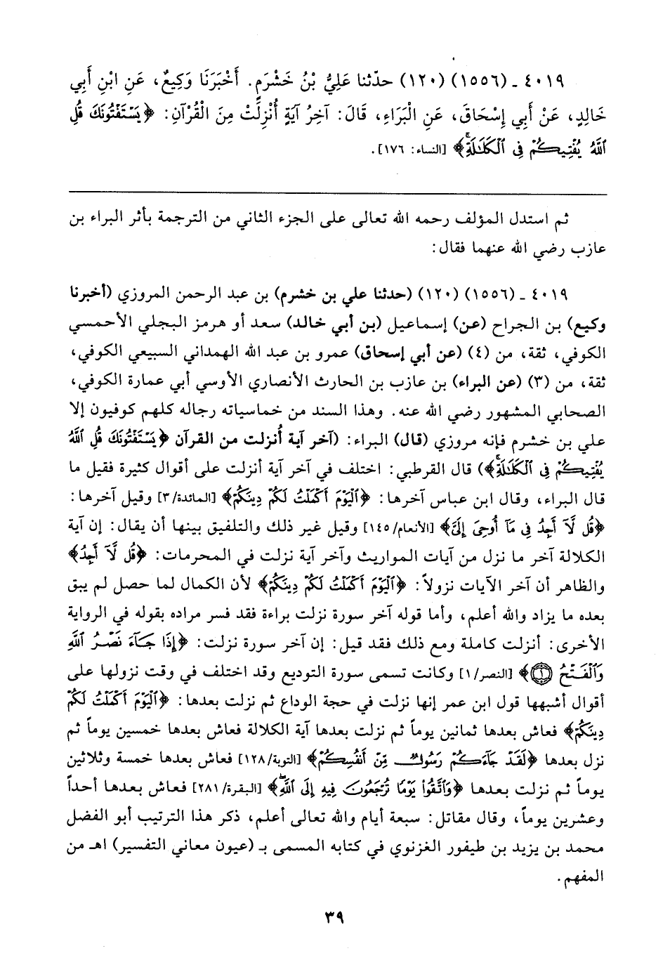 ٤٠١٩ - (١٥٥٦) (١٢٠) (حدثنا علي بن خشرم) بن عبد الرحمن المروزي (أخبرنا وكيع) بن الجراح (عن) إسماعيل (بن أبي خالد) سعد أو هرمز البجلي الأحمسي الكوفي، ثقة، من (٤) (عن أبي إسحاق) عمرو بن عبد الله الهمداني السبيعي الكوفي، ثقة، من (٣) (عن البراء) بن عازب بن الحارث الأنصاري الأوسي أبي عمارة الكوفي، الصحابي المشهور رضي الله عنه. وهذا السند من خماسياته رجاله كلهم كوفيون إلا علي بن خشرم فإنه مروزي (قال) البراء: (آخر آية أُنزلت من القرآن {يَسْتَفْتُونَكَ قُلِ اللَّهُ يُفْتِيكُمْ فِي الْكَلَالةِ}) قال القرطبي: اختلف في آخر آية أنزلت على أقوال كثيرة فقيل ما قال البراء، وقال ابن عباس آخرها: {الْيَوْمَ أَكْمَلْتُ لَكُمْ دِينَكُمْ} [المائدة: ٣] وقيل آخرها: {قُلْ لَا أَجِدُ فِي مَا أُوحِيَ إِلَيَّ} [الأنعام: ١٤٥] وقيل غير ذلك والتلفيق بينها أن يقال: إن آية الكلالة آخر ما نزل من آيات المواريث وآخر آية نزلت في المحرمات: {قُلْ لَا أَجِدُ} والظاهر أن آخر الآيات نزولًا: {الْيَوْمَ أَكْمَلْتُ لَكُمْ دِينَكُمْ} لأن الكمال لما حصل لم يبق بعده ما يزاد والله أعلم، وأما قوله آخر سورة نزلت براءة فقد فسر مراده بقوله في الرواية الأخرى: أنزلت كاملة ومع ذلك فقد قيل: إن آخر سورة نزلت: {إِذَا جَاءَ نَصْرُ اللَّهِ وَالْفَتْحُ (١)} [النصر: ١] وكانت تسمى سورة التوديع وقد اختلف في وقت نزولها على أقوال أشبهها قول ابن عمر إنها نزلت في حجة الوداع ثم نزلت بعدها: {الْيَوْمَ أَكْمَلْتُ لَكُمْ دِينَكُمْ} فعاش بعدها ثمانين يومًا ثم نزلت بعدها آية الكلالة فعاش بعدها خمسين يومًا ثم نزل بعدها {لَقَدْ جَاءَكُمْ رَسُولٌ مِنْ أَنْفُسِكُمْ} [التوبة: ١٢٨] فعاش بعدها خمسة وثلاثين يومًا ثم نزلت بعدها {وَاتَّقُوا يَوْمًا تُرْجَعُونَ فِيهِ إِلَى اللَّهِ} [البقرة: ٢٨١] فعاش بعدها أحدًا وعشرين يومًا، وقال مقاتل: سبعة أيام والله تعالى أعلم، ذكر هذا الترتيب أبو الفضل محمد بن يزيد بن طيفور الغزنوي في كتابه المسمى بـ (عيون معاني التفسير) اهـ من المفهم.