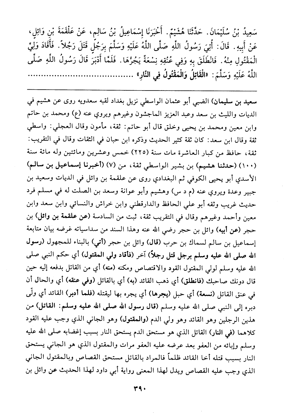 سَعِيدُ بْنُ سُلَيمَانَ. حَدَّثَنَا هُشَيمٌ. أَخْبَرَنَا إِسْمَاعِيلُ بْنُ سَالِمٍ، عَنْ عَلْقَمَةَ بْنِ وَائِلٍ، عَنْ أَبِيهِ. قَال: أُتِيَ رَسُولُ اللهِ صَلَّى اللهُ عَلَيهِ وَسَلَّمَ بِرَجُلٍ قَتَلَ رَجُلًا. فَأَقَادَ وَلِيَّ الْمَقْتُولِ مِنْهُ. فَانْطَلَقَ بِهِ وَفِي عُنُقِهِ نِسْعَةٌ يَجُرُّهَا. فَلَمَّا أَدْبَرَ قَال رَسُولُ اللهِ صَلَّى اللهُ عَلَيهِ وَسَلَّمَ: "الْقَاتِلُ وَالْمَقْتُولُ في النَّارِ"