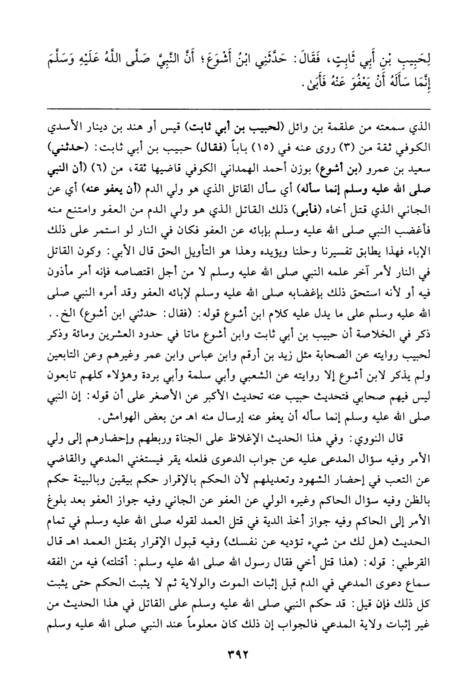 الذي سمعته من علقمة بن وائل (لحبيب بن أبي ثابت) قيس أو هند بن دينار الأسدي الكُوفيّ ثِقَة من (٣) روى عنه في (١٥) بابا (فقال) حبيب بن أبي ثابت: (حَدَّثني) سعيد بن عمرو (بن أشوع) بوزن أَحْمد الهمداني الكُوفيّ قاضيها ثِقَة، من (٦) (أن النَّبِيّ صلى الله عليه وسلم إنما سأله) أي سأل القاتل الذي هو ولي الدم (أن يعفو عنه) أي عن الجاني الذي قتل أخاه (فأبى) ذلك القاتل الذي هو ولي الدم من العفو وامتنع منه فأغضب النَّبِيّ صلى الله عليه وسلم بإبائه عن العفو فكان في النَّار لو استمر على ذلك الإباء فهذا يطابق تفسيرنا وحلنا ويؤيده وهذا هو التأويل الحق قال الأبي: وكون القاتل في النَّار لأمر آخر علمه النَّبِيّ صلى الله عليه وسلم لا من أَجل اقتصاصه فإنَّه أمر مأذون فيه أو لأنه استحق ذلك بإغضابه صلى الله عليه وسلم لإبائه العفو وقد أمره النَّبِيّ صلى الله عليه وسلم على ما يدل عليه كلام ابن أشوع قوله: (فقال: حَدَّثني ابن أشوع) الخ .. ذكر في الخلاصة أن حبيب بن أبي ثابت وابن أشوع ماتا في حدود العشرين ومائة وذكر لحبيب روايته عن الصَّحَابَة مثل زيد بن أرقم وابن عباس وابن عمر وغيرهم وعن التابعين ولم يذكر لابن أشوع إلَّا روايته عن الشعبي وأبي سلمة وأبي بردة وهؤلاء كلهم تابعون ليس فيهم صحابي فتحديث حبيب عنه تحديث الأكبر عن الأصغر على أن قوله: إن النَّبِيّ صلى الله عليه وسلم إنما سأله أن يعفو عنه إرسال منه اهـ من بعض الهوامش.