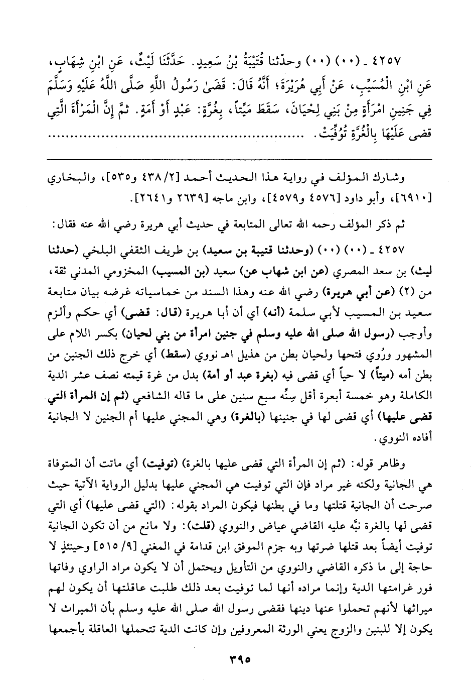 ٤٢٥٧ - (٠٠) (٠٠) (وحدثنا قتيبة بن سعيد) بن طريف الثَّقَفيّ البلخي (حَدَّثَنَا ليث) بن سعد المصري (عن ابن شهاب عن) سعيد (بن المسيّب) المخزومي المدنِيُّ ثِقَة، من (٢) (عن أبي هريرة) رضي الله عنه وهذا السند من خماسياته غرضه بيان متابعة سعيد بن المسيّب لأبي سلمة (أنَّه) أي أن أَبا هريرة (قال: قضى) أي حكم وألزم وأوجب (رسول الله صلى الله عليه وسلم في جنين امرأة من بني لحيان) بكسر اللام على المشهور ورُوي فتحها ولحيان بطن من هذيل اهـ نووي (سقط) أي خرج ذلك الجنين من بطن أمه (ميتًا) لا حيًّا أي قضى فيه (بغرة عبد أو أمة) بدل من غرة قيمته نصف عشر الدية الكاملة وهو خمسة أبعرة أقل سِنِّه سبع سنين على ما قاله الشَّافعيّ (ثم إن المرأة التي قضى عليها) أي قضى لها في جنينها (بالغرة) وهي المجني عليها أم الجنين لا الجانية أفاده النووي.
