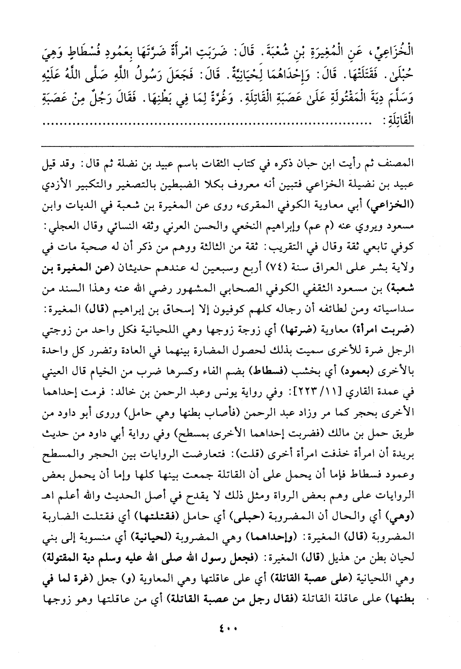 الْخُزَاعِيِّ، عَنِ الْمُغِيرَةِ بْنِ شُعْبَةَ. قَال: ضَرَبَتِ امْرأَةٌ ضَرَّتَهَا بِعَمُودِ فُسْطَاطٍ وَهِيَ حُبْلَى. فَقَتَلَتْهَا. قَال: وَإحْدَاهُمَا لِحْيَانِيَّةٌ. قَال: فَجَعَلَ رَسُولُ اللهِ صَلَّى الله عَلَيهِ وَسلَّمَ دِيَةَ الْمَقْتُولَةِ َعَلَى عَصَبَةِ الْقَاتِلَةِ. وَغُرَّةً لِمَا في بَطْنِهَا. فَقَال رَجُلٌ مِنْ عَصَبَةِ الْقَاتِلَةِ: