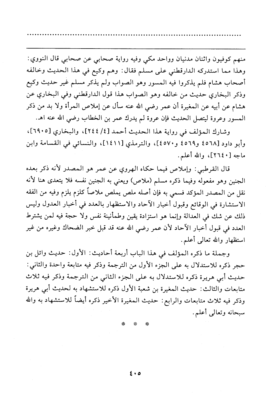 منهم كوفيون واثنان مدنيان وواحد مكّيّ وفيه رواية صحابي عن صحابي قال النووي: وهذا مما استدركه الدارقطني على مسلم فقال: وهم وكيع في هذا الحديث وخالفه أصحاب هشام فلم يذكروا فيه المسور وهو الصواب ولم يذكر مسلم غير حديث وكيع وذكر البُخَارِيّ حديث من خالفه وهو الصواب هذا قول الدارقطني وفي البُخَارِيّ عن هشام عن أَبيه عن المغيرة أن عمر رضي الله عنه سأل عن إملاص المرأة ولا بد من ذكر المسور وعروة ليتصل الحديث فإن عروة لم يدرك عمر بن الخطاب رضي الله عنه اهـ.