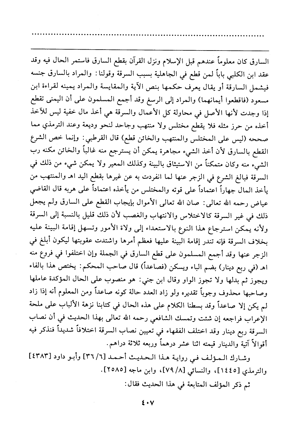 السارق كان معلومًا عندهم قبل الإِسلام ونزل القرآن بقطع السارق فاستمر الحال فيه وقد عقد ابن الكلبي بابا لمن قطع في الجاهلية بسبب السرقة وقولنا: والمراد بالسارق جنسه فيشمل السارقة أو يقال يعرف حكمها بنص الآية والمقايسة والمراد يمينه لقراءة ابن مسعود (فاقطعوا أيمانهما) والمراد إلى الرسغ وقد أجمع المسلمون على أن اليمنى تقطع إذا وجدت لأنها الأصل في محاولة كل الأعمال والسرقة هي أخذ مال خفية ليس للآخذ أخذه من حرز مثله فلا يقطع مختلس ولا منتهب وجاحد لنحو وديعة وعند التِّرْمِذِيّ مما صححه (ليس على المختلس والمنتهب والخائن قطع) قال القرطبي: وإنما خص الشرع القطع بالسارق لأن أخذ الشيء مجاهرة يمكن أن يسترجع منه غالبًا والخائن مكنه رب الشيء منه وكان متمكنًا من الاستيثاق بالبينة وكذلك المعير ولا يمكن شيء من ذلك في السرقة فبالغ الشرع في الزجر عنها لما انفردت به عن غيرها بقطع اليد اهـ والمنتهب من يأخذ المال جهارًا اعتمادًا على قوته والمختلس من يأخذه اعتمادًا على هربه قال القاضي عياض رحمه الله تعالى: وإن الله تعالى الأموال بإيجاب القطع على السارق ولم يجعل ذلك في غير السرقة كالاختلاس والانتهاب والغصب لأن ذلك قليل بالنسبة إلى السرقة ولأنه يمكن استرجاع هذا النوع بالاستعداء إلى ولاة الأمور وتسهل إقامة البينة عليه بخلاف السرقة فإنَّه تندر إقامة البينة عليها فعظم أمرها واشتدت عقوبتها ليكون أبلغ في الزجر عنها وقد أجمع المسلمون على قطع السارق في الجملة وإن اختلفوا في فروع منه اهـ (في ربع دينار) بضم الباء ويسكن (فصاعدًا) قال صاحب المحكم: يختص هذا بالفاء ويجوز ثم بدلها ولا تجوز الواو وقال ابن جني: هو منصوب على الحال المؤكدة عاملها وصاحبها محذوف وجوبًا تقديره ولو زاد العدد حالة كونه صاعدًا ومن المعلوم أنَّه إذا زاد لم يكن إلَّا صاعدًا وقد بسطنا الكلام على هذه الحال في كتابنا نزهة الألباب على ملحة الإعراب فراجعه إن شئت وتمسك الشَّافعيّ رحمه الله تعالى بهذا الحديث في أن نصاب السرقة ربع دينار وقد اختلف الفقهاء في تعيين نصاب السرقة اختلافًا شديدًا فنذكر فيه أقوالًا آتية والدينار قيمته اثنا عشر درهمًا وربعه ثلاثة دراهم.