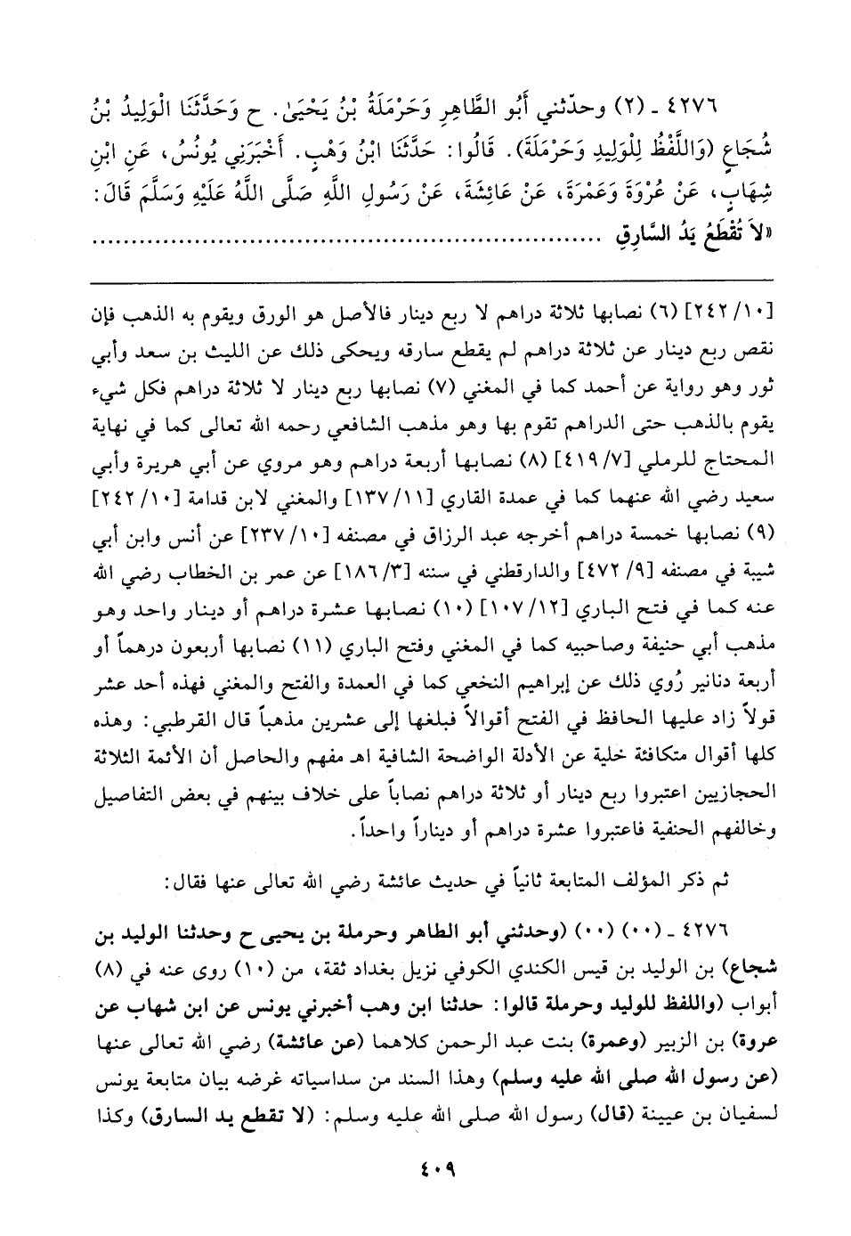 ٤٢٧٦ - (٠٠) (٠٠) (وحدثني أبو الطاهر وحرملة بن يحيى ح وحدثنا الوليد بن شجاع) بن الوليد بن قيس الكندي الكُوفيّ نزيل بغداد ثِقَة، من (١٠) روى عنه في (٨) أبواب (واللفظ للوليد وحرملة قالوا: حَدَّثَنَا ابن وهب أخبرني يونس عن ابن شهاب عن عروة) بن الزُّبير (وعمرة) بنت عبد الرَّحْمَن كلاهما (عن عائشة) رضي الله تعالى عنها (عن رسول الله صلى الله عليه وسلم) وهذا السند من سداسياته غرضه بيان متابعة يونس لسفيان بن عيينة (قال) رسول الله صلى الله عليه وسلم: (لا تقطع يد السارق) وكذا
