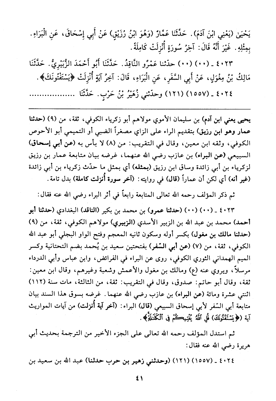 ٤٠٢٣ - (٠٠) (٠٠) (حدثنا عمرو) بن محمد بن بكير (الناقد) البغدادي (حدثنا أبو أحمد) محمد بن عبد الله بن الزبير الأسدي (الزبيري) مولاهم الكوفي، ثقة، من (٩) (حدثنا مالك بن مغول) بكسر أوله وسكون ثانيه المعجم وفتح الواو البجلي أبو عبد الله الكوفي، ثقة، من (٧) (عن أبي السّفر) بفتحتين سعيد بن يُحمد بضم التحتانية وكسر الميم الهمداني الثوري الكوفي، روى عن البراء في الفرائض، وابن عباس وأبي الدرداء مرسلًا، ويروي عنه (ع) ومالك بن مغول والأعمش وشعبة وغيرهم، وقال ابن معين: ثقة، وقال أبو حاتم: صدوق، وقال في التقريب: ثقة، من الثالثة، مات سنة (١١٢) اثنتي عشرة ومائة (عن البراء) بن عازب رضي الله عنهما. غرضه بسوق هذا السند بيان متابعة أبي السّفر لأبي إسحاق السبيعي (قال) البراء: (آخر آية أُنزلت) من آيات المواريث آية ({يَسْتَفْتُونَكَ قُلِ اللَّهُ يُفْتِيكُمْ فِي الْكَلَالةِ}.